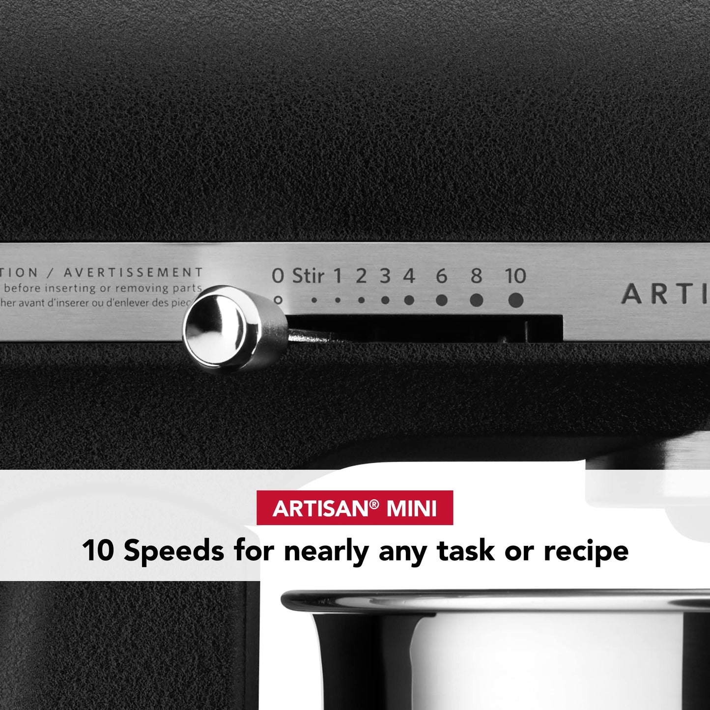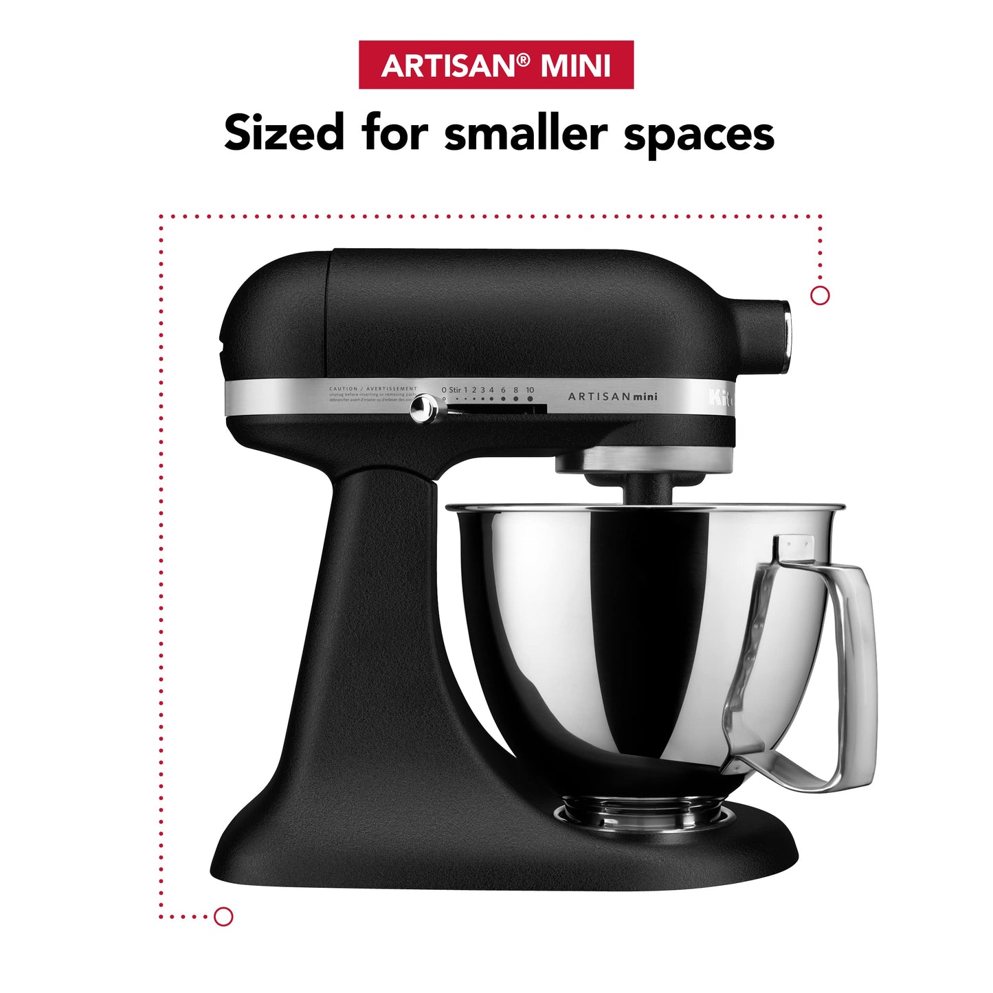 Details: Lighter. Smaller. Just as Powerful.* When you still need the power but don't quite have the space, the KitchenAid® Artisan® Mini Tilt-Head Stand Mixer can whip up the recipes you love without taking over your kitchen counter. This durable tilt-head stand mixer was built to last, and can mix up to 5 dozen** cookies in a single batch. It features 10 speeds to gently knead, thoroughly mix and whip ingredients for a wide variety of recipes. Whether you're craving fresh guacamole, gently shredded pulled pork or a single, flavorful pan of meatloaf, the Artisan Mini can help you create a variety of small-batch, hand-crafted possibilities. Get creative and make more with your mixer with over 10 optional hub-powered attachments***, from food grinders to pasta makers and more. *Compared with the KitchenAid® Classic™ Stand Mixer. **Using the flat beater; 28g dough each ***sold separately.