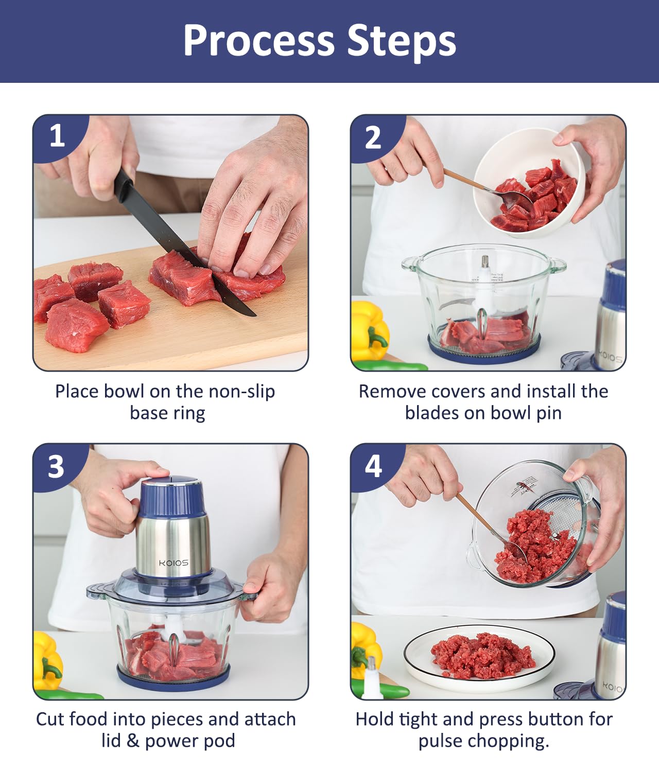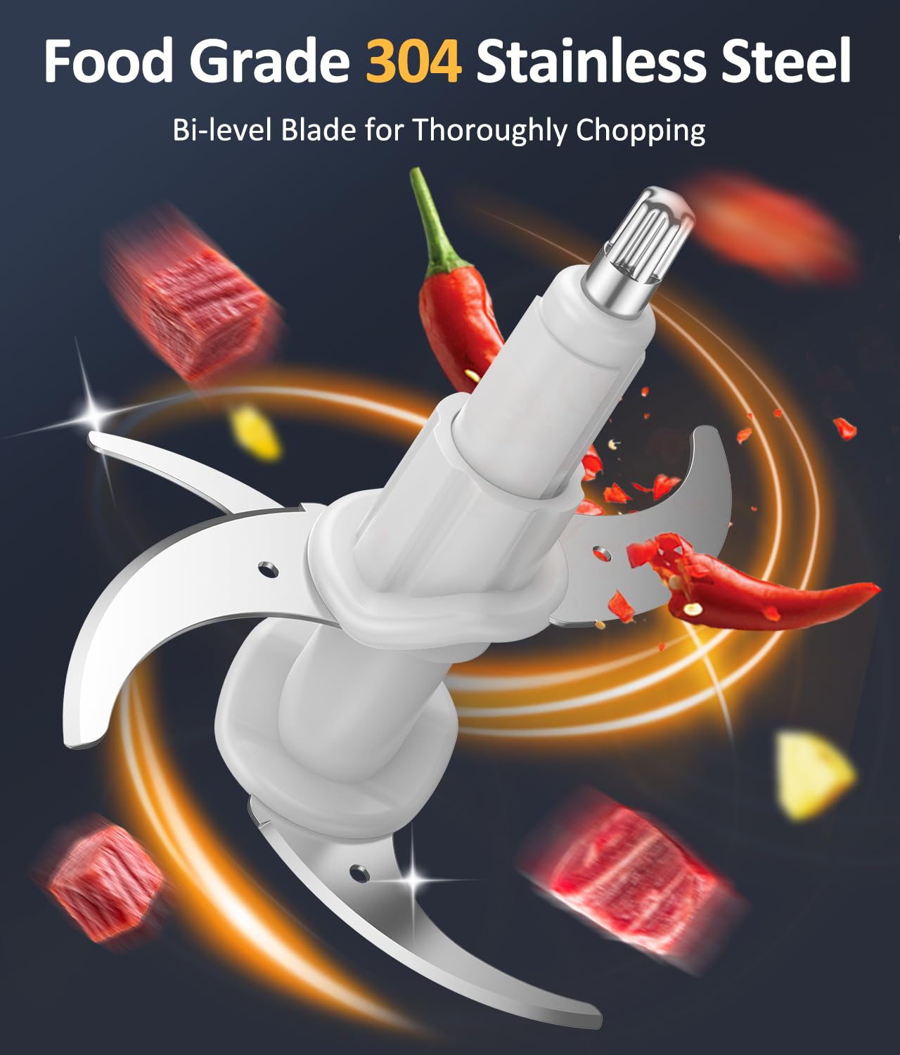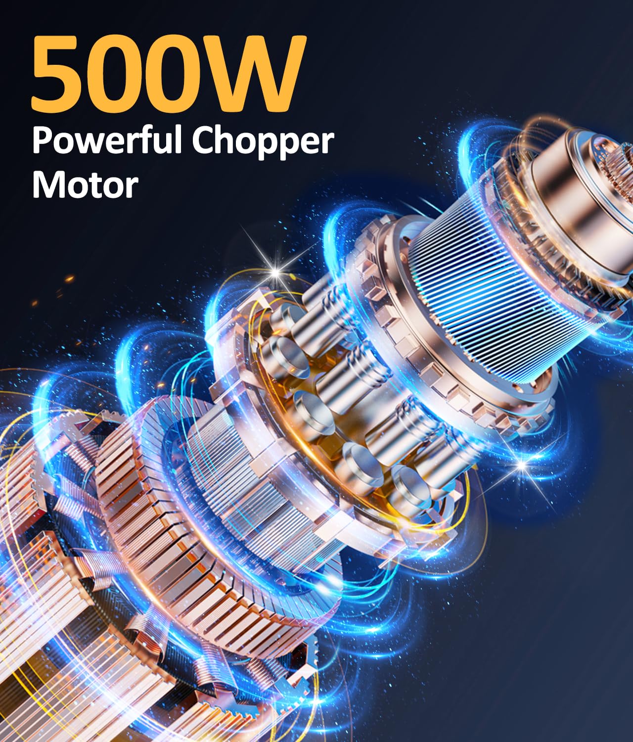 - Mulitfunctional--Built with a 500W powerful pure copper motor and S shaped Bi-level blades, this electric food chopper is able to chop, blend, puree, mix and mince throughly and evenly in no time, with each task taking approximately 10 seconds to done.