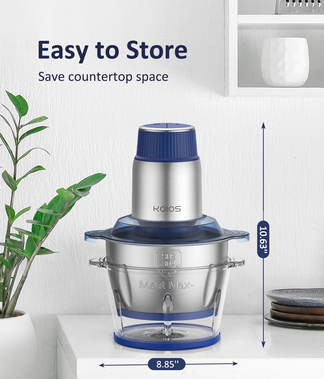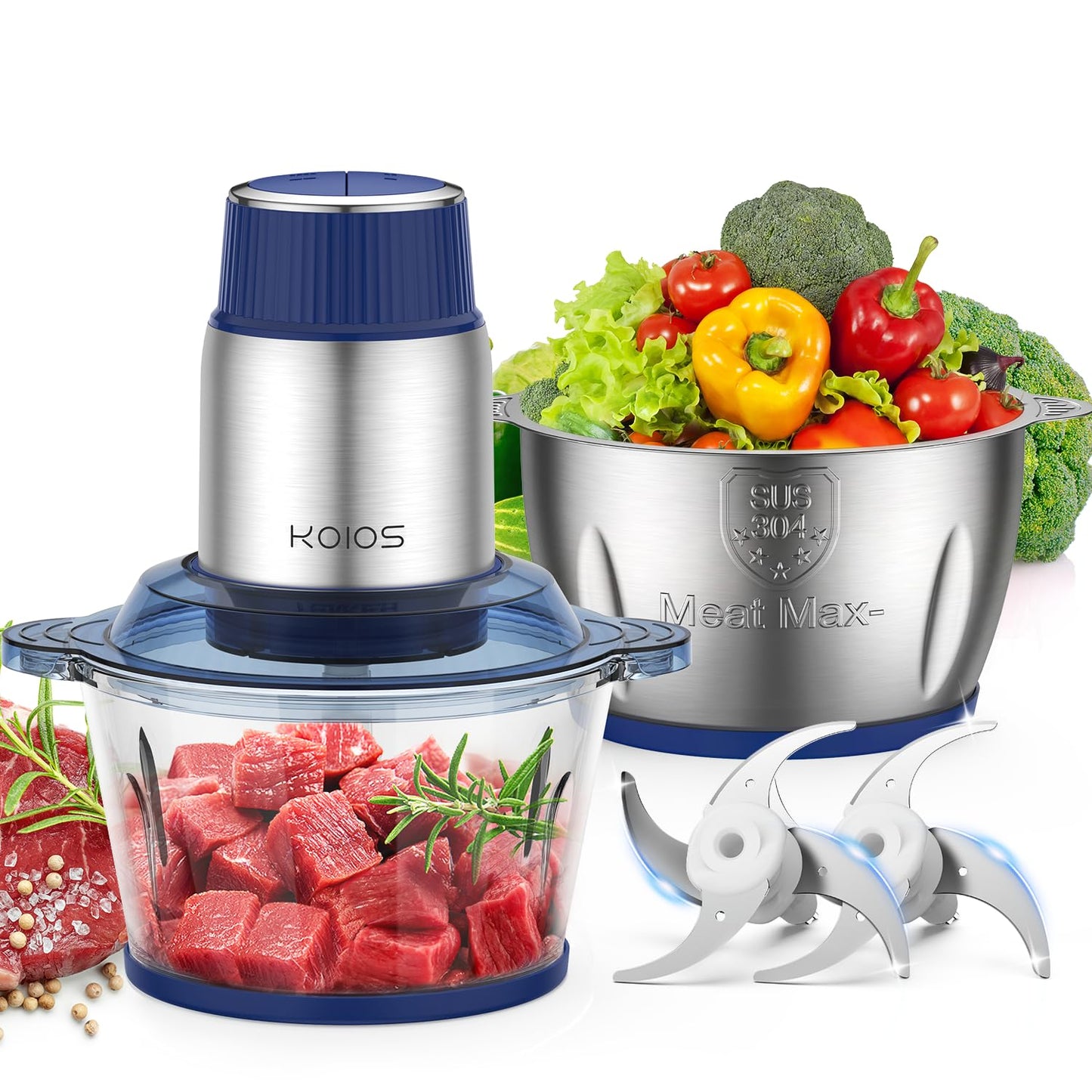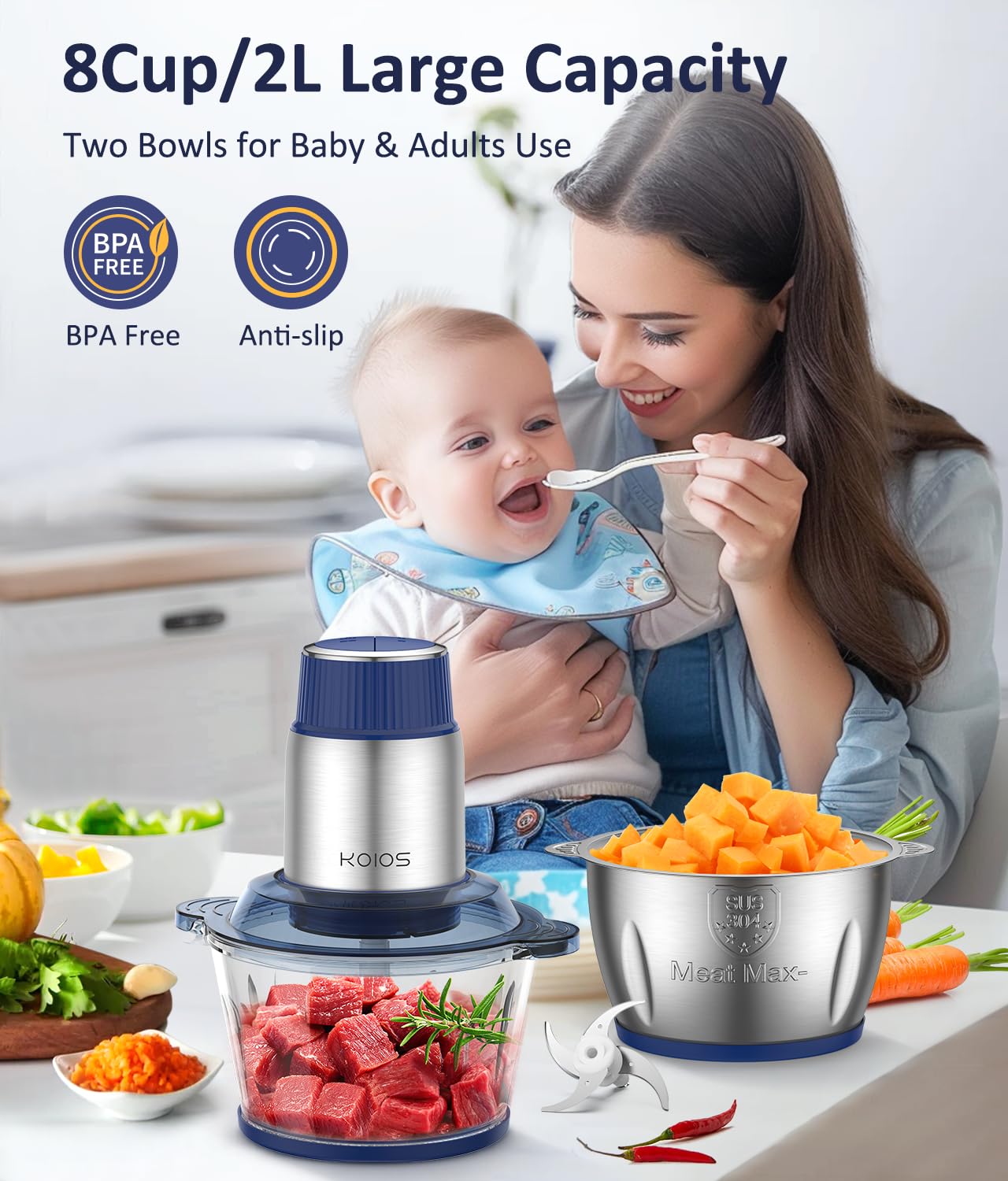 KOIOS Small Food Processor with 2 Bowls (8 Cup+8 Cup) & 2 Sets Bi-level Blade, 2L Electric Food Chopper Meat Grinder for Meat/Vegetable/Fruits/Nuts/Baby Food, 500W, 2 Speed Modes