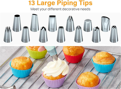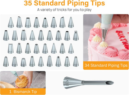 - All-in-one Design: 35 small piping tips, 13 large icing sets, 2 reusable pastry bags, 1 big coupler, 2 small couplers and 1 flower nail decoration kits are helps you create beautiful patterns.