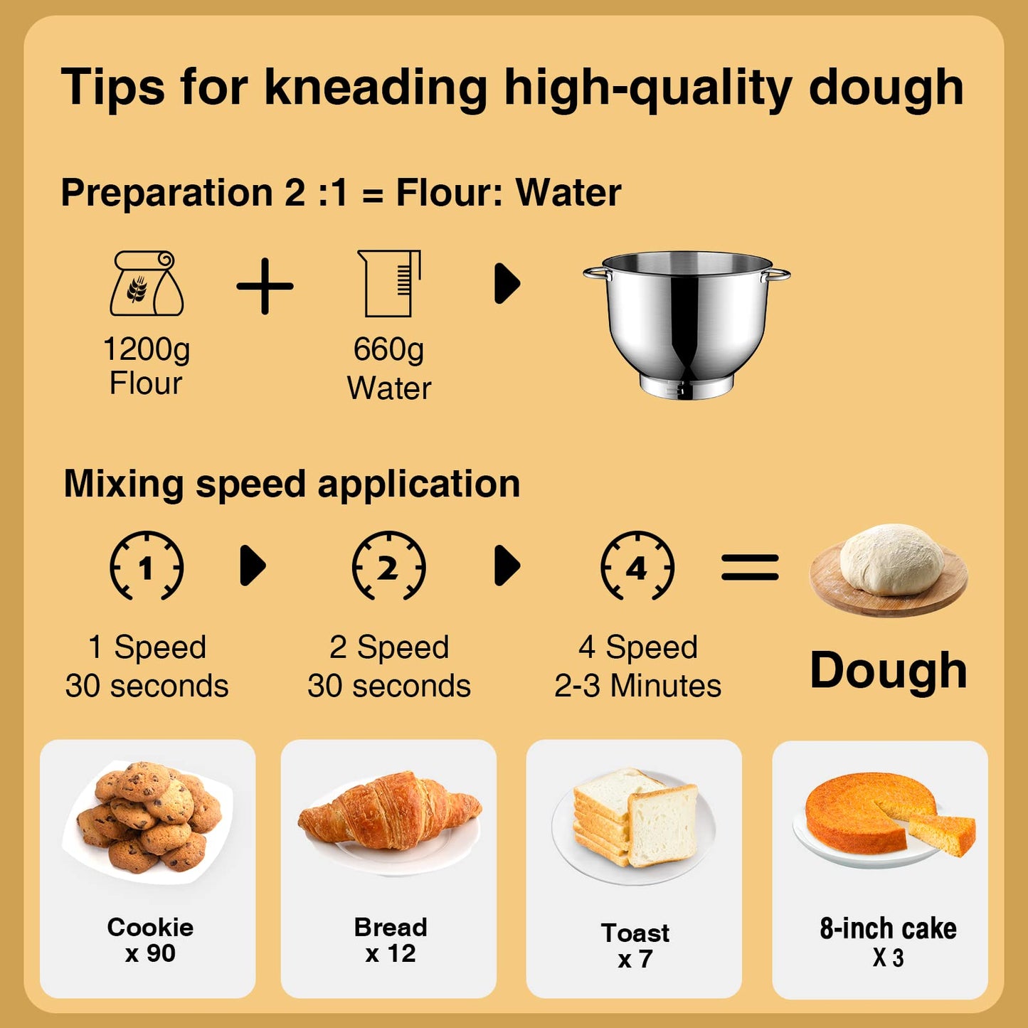 - 6 SPEED OPTION-Precise 6 speed controller lets you choose from a slow stir to a fast mix, The powerful performance of planetary mixing action for mixing bread dough, thick batters, meringues, and whipping cream, plus lower speeds for stirring and finessing your most delicate concoctions. perfectly suitable to different ingredients.