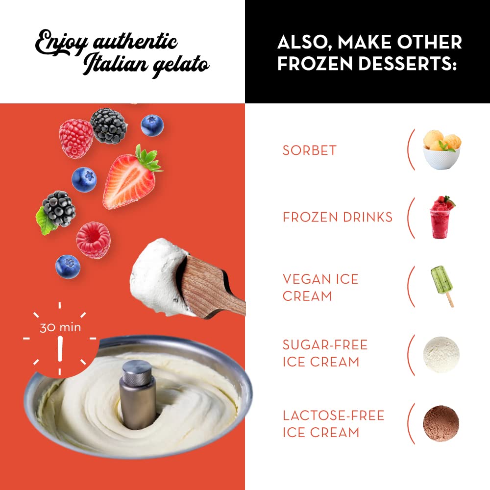 Fully automatic and precisely controlled by a timer, this machine takes the trouble and guesswork out of making ice cream, sorbet, frozen yogurt, gelato, and frozen drinks at home. Ingredients go into the bowl, the timer is set, two buttons are pressed and about 30 minutes later 1-1/2 quarts of a frozen confection are ready for consumption. Because the machine doesn't require its bowl to be frozen for hours in a refrigerator's freezer (like less expensive machines that only churn), it can immediately begin making another batch. If a batch becomes too hard the machine shuts off automatically. Not only does it work professionally it looks the part, as the housing, bowl, and paddle are made of stainless steel for sanitation and easy cleaning. The 100-watt machine measures 12 inches wide, 11 inches high, and 18 inches deep, and it weighs 38 pounds. Made it Italy, it carries a one-year warranty against defects. An instruction booklet with many recipes is included. --Fred Brack