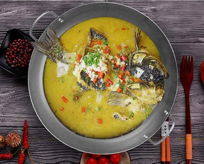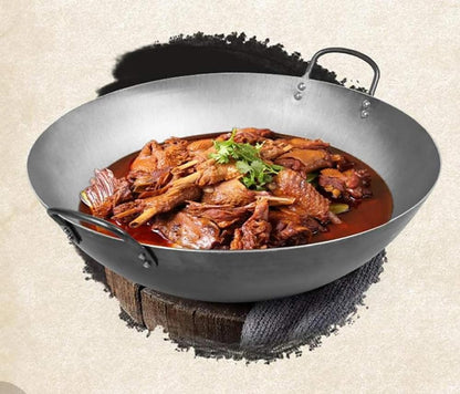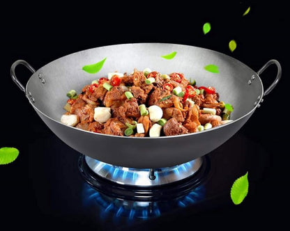 Details: Size: 36cm, 40cm, 45cm, 50cmFeatures: Smoke-free, Coating, Sticky, Rust-freeThe body and the ear are connected by rivets, which are not easy to peel off .Universal open flame round bottom: universal open flame round bottom, suitable for all types of open flame stoves.Good thermal conductivity: The thickness of the pot body is about 1.8 mm and the heat conduction is fast. It is suitable for frying and gas saving.Instructions for first use:Before using the new iron pot, boil a pot of water, wash the pot, heat it on the stove and dry the pot with cooking oil.Instructions for daily maintenance:1. Do not burn the pot to avoid burning the pot. If there is high temperature air, keep the pot away from the heat source and cool it . Do not use external force to cool, it is easy to damage the pot.2.If you want to clean the pot when it is hot, the pot cools quickly first, avoid the deformation of the pot due to thermal expansion and contraction. Place the pot in a , well-ventilated place to prevent rust.