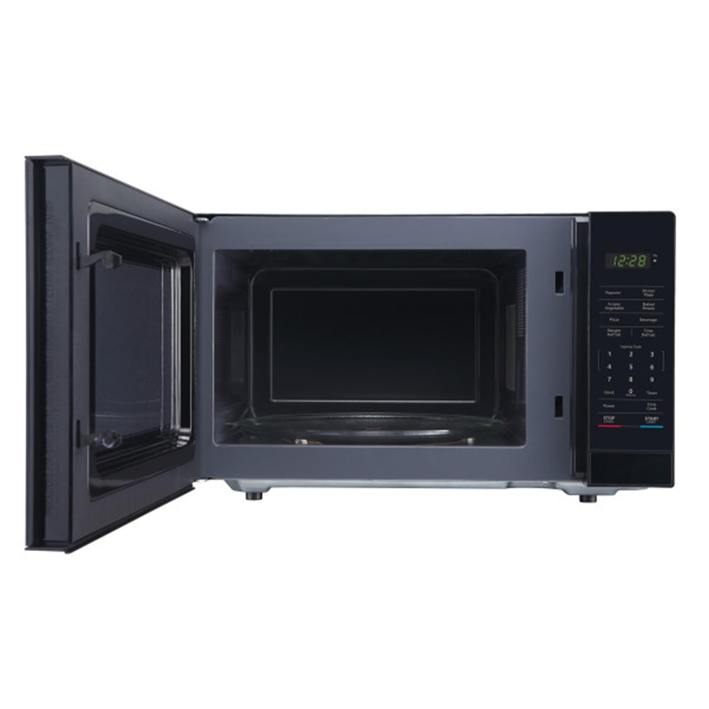 - Compact and Sleek: The glass turntable in this compact microwave rotates as the machine runs, resulting in even cooking every time; The microwave features a black exterior, black ceramic interior, and easy door-release button