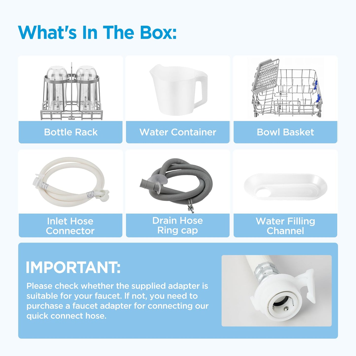 - 【No installation needed】-- Adding water manually in the 5L built-in water tank, you can put the dishwasher in any suitable place without connecting to tap water. Or it can be hooked to the kitchen faucet directly with the included water hose (Adapter included).