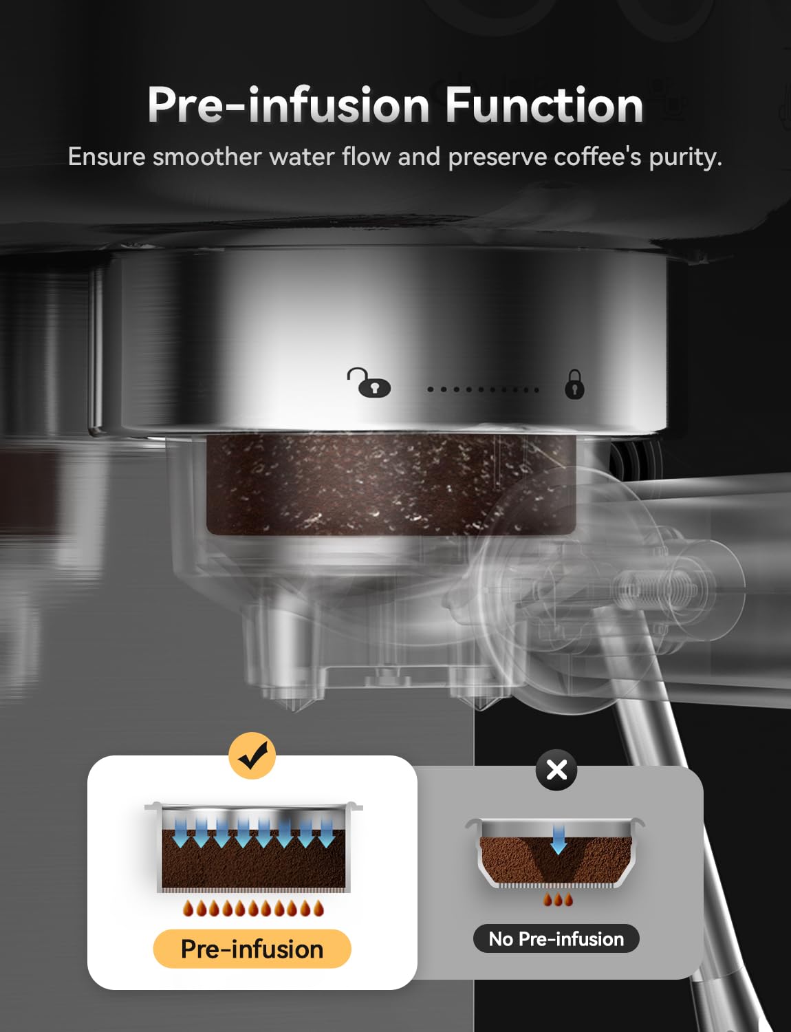 - ✅PRE-INFUSION FUNCTION - Neretva espresso coffee maker has Low pressure pre infusion, which gradually increases pressure at the start and effectively reduces air bubbles generated during the extraction process. It helps to ensure all the flavors are drawn out evenly during the extraction for a balanced tasting cup.