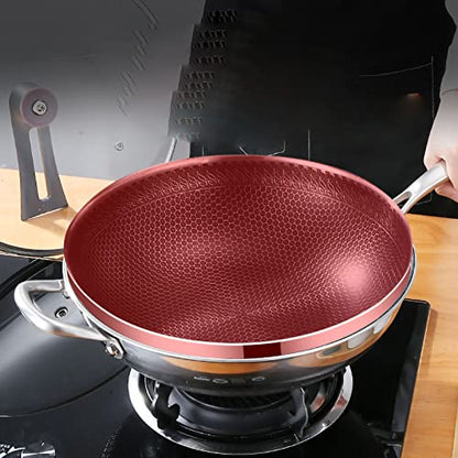 - Ergonomic Design: The stainless steel wok uses double sided honeycomb, which is strong anti sticking.The handles and ears are ergonomically designed to give a comfortable grip and make cooking more comfortable.for gas, induction or electric cooktop use.