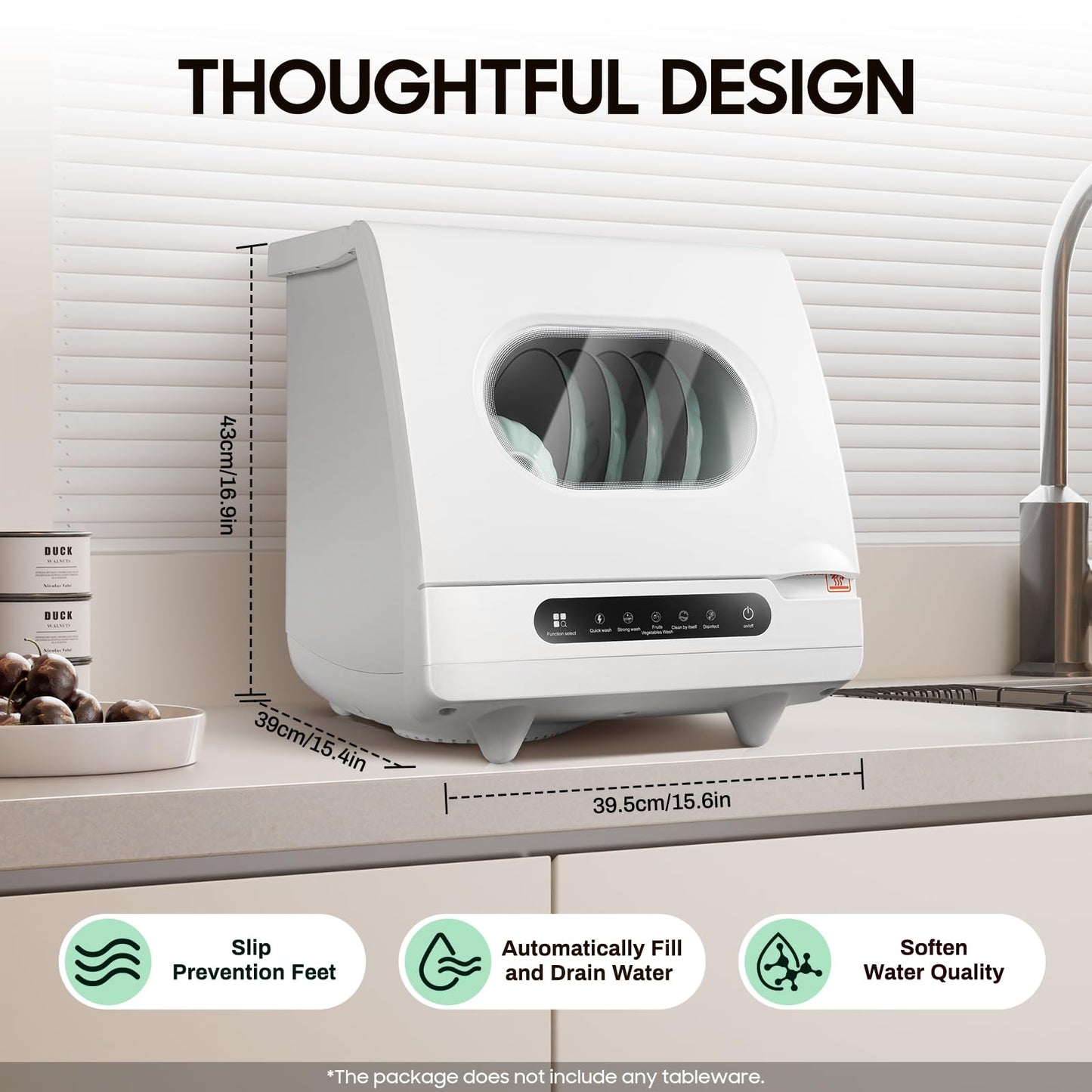- 💧【Thoughtful Designs】This dishwasher uses only 2 gallons of water to wash dishes, saving more water than hand washing. It has a front lid that flips up to open and close by hand and includes a transparent section to check the washing process clearly. It also features a removable internal filter for food scraps, making dumping and cleaning simple and convenient.