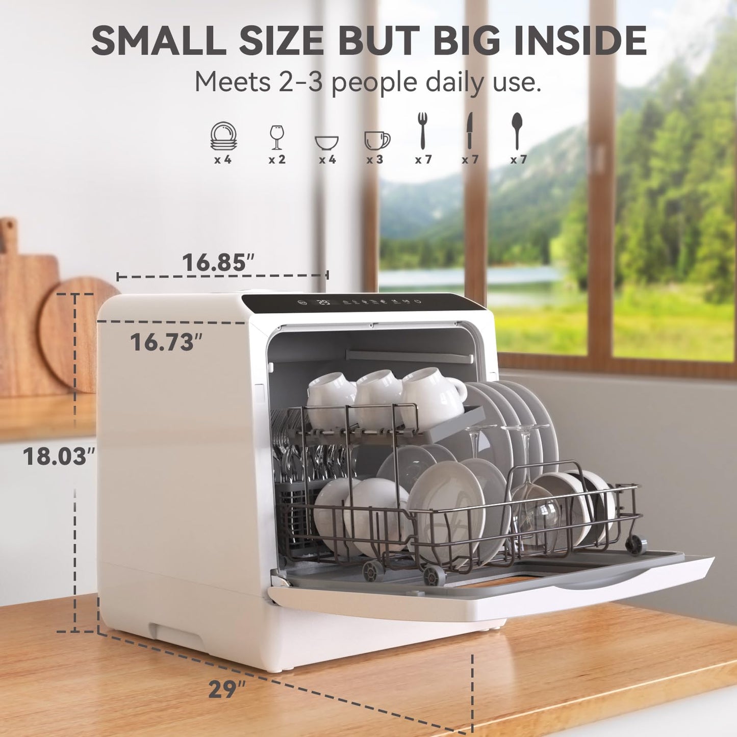 - 【COMPACT DESIGN】This portable dishwasher only measures 16.85 × 16.73 × 18.03 inches with a standard capacity of 4 place settings and can fit a variety of dishes (up to 10.25-inch dishes loaded at an angle). Efficiently meeting the daily needs of a family of 3-4, This portable dishwasher is perfect for small-sized houses, apartments, dorms, boats, and campers/RVs.
