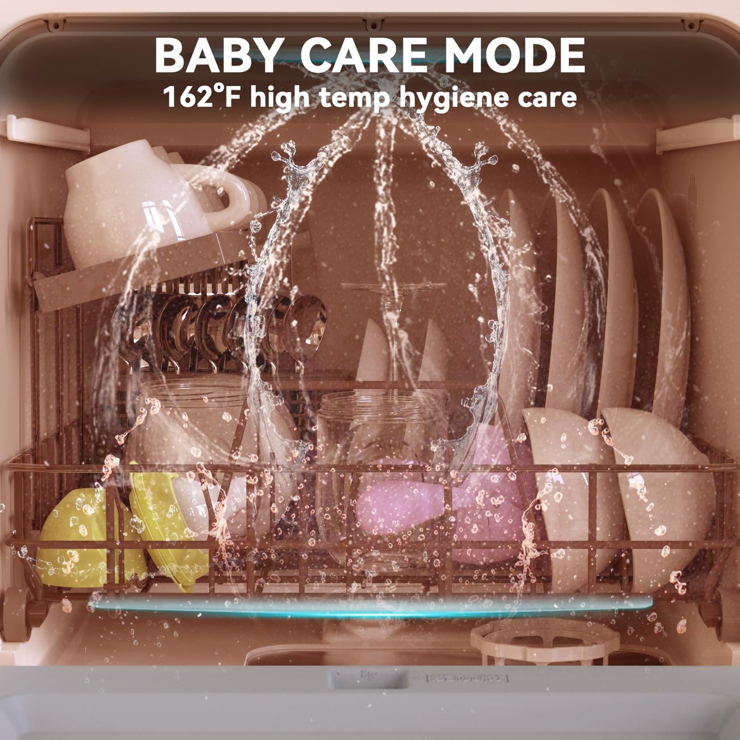 - 【BABY BOTTLE WASHER】Baby care mode(Strong Cleaning) will perform four alternate washing cycles of cold and hot water. The steam generated by the water temperature of 167℉ can deeply clean baby bottles, toys, and heavily soiled dishes and make your glassware sparkling.