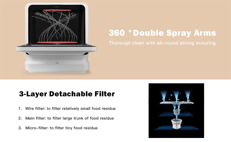 - 💦360° DOUBLE SPRAY ARMS FOR EFFECTIVE RINSING------Top and lower spray arms of the portable dishwasher can swivel 360 °and rinses off various degrees of the stain from all angles. The compact dishwasher has a total of 22 water ports to provide powerful water spray, convenience for cleaning pots and pans and single serve dishes. There is a designated spot for you to place a cleaning tablet or you can just throw the dishwasher powder into the machine.