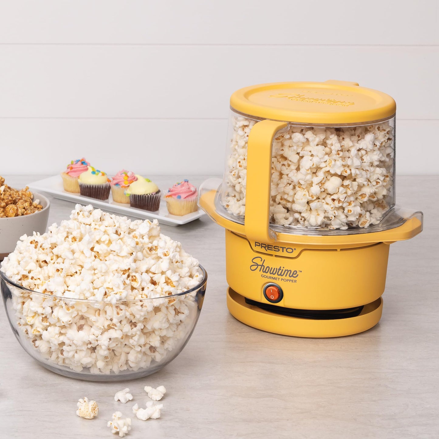 Presto 05206 Showtime Gourmet Oil Popcorn Popper - 9-Cups, Built-In Serving Bowl, Compact Design, Ceramic Nonstick, PFAS Free, Yellow