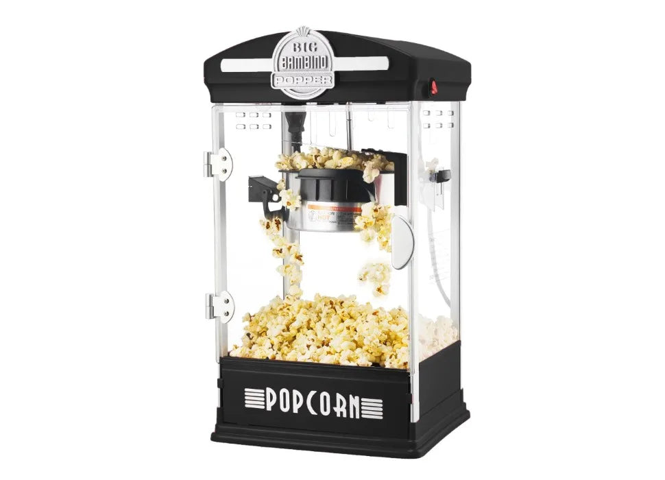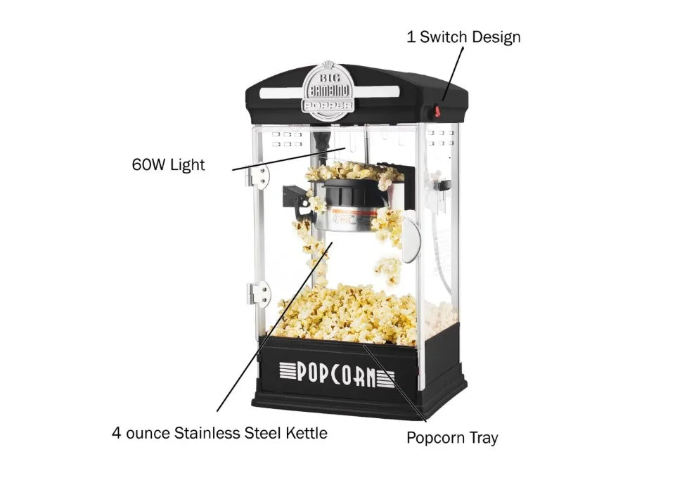 - COUNTERTOP MODEL - This 480W tabletop popcorn maker machine for home has an attractive design aimed to capture the look of a movie theater popcorn machine, yet its compact size is sure to fit on any countertop.