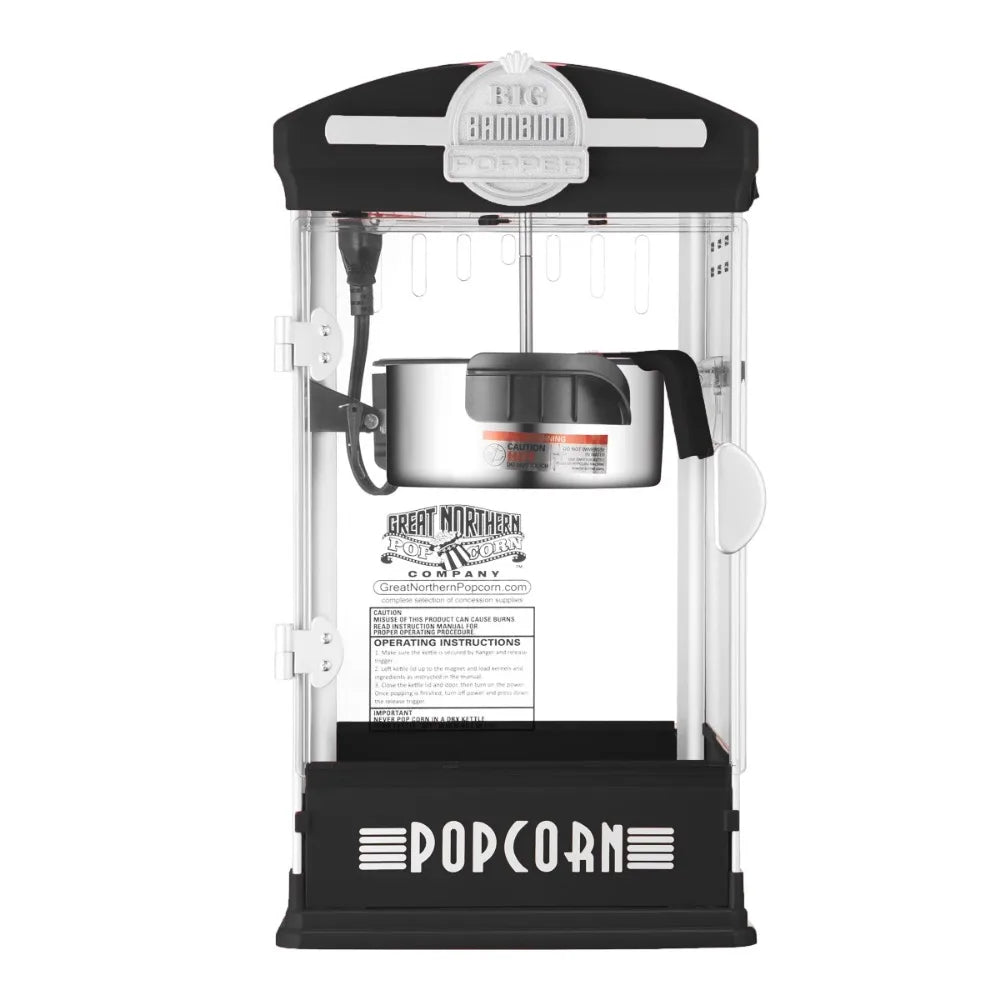 Bring movie theater style popcorn to your home or office with the Big Bambino Popcorn Maker Machine by Great Northern Popcorn. The vintage popcorn maker includes a 4-ounce stainless steel kettle that makes about 1.5 gallons of popcorn in minutes, a 60W light in the ceiling, a drop-down tray under the door for access to scoop the popcorn, and a one switch design that makes popping hot popcorn fast and simple. This 480W tabletop popcorn maker machine for home has an attractive design aimed to capture the look of a movie theater popcorn machine, yet its compact size is sure to fit on any countertop.