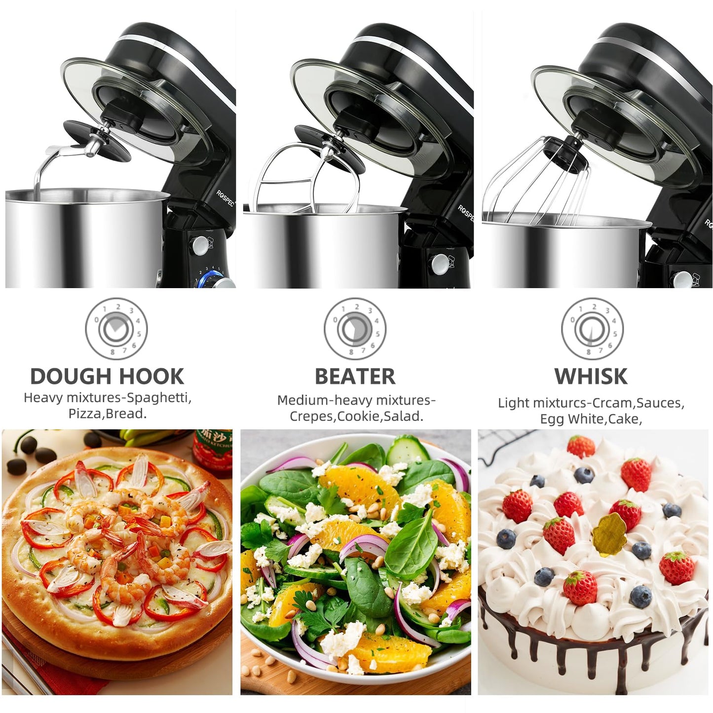 - 8 Stepless Speeds and LED light - beautiful when used, more stirring speed options, improve your cooking efficiency. Used to mix bread dough, thick batter, meringue and whipped cream, as well as lower speeds for stirring and refining the most delicate mixtures. Reach top speed in a second, perfect for beating egg whites and mixing.