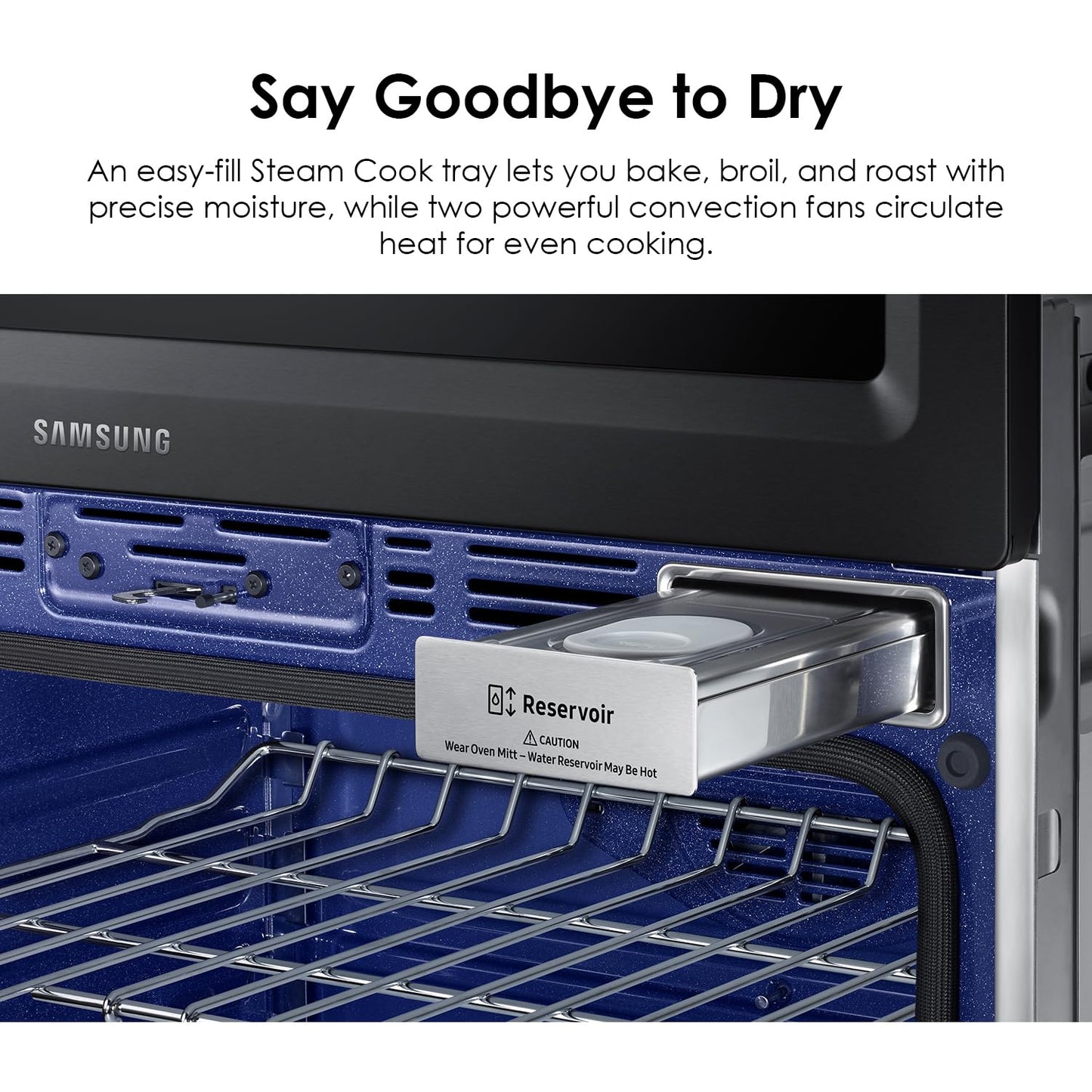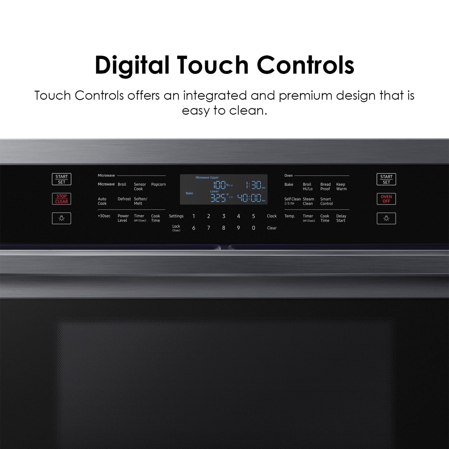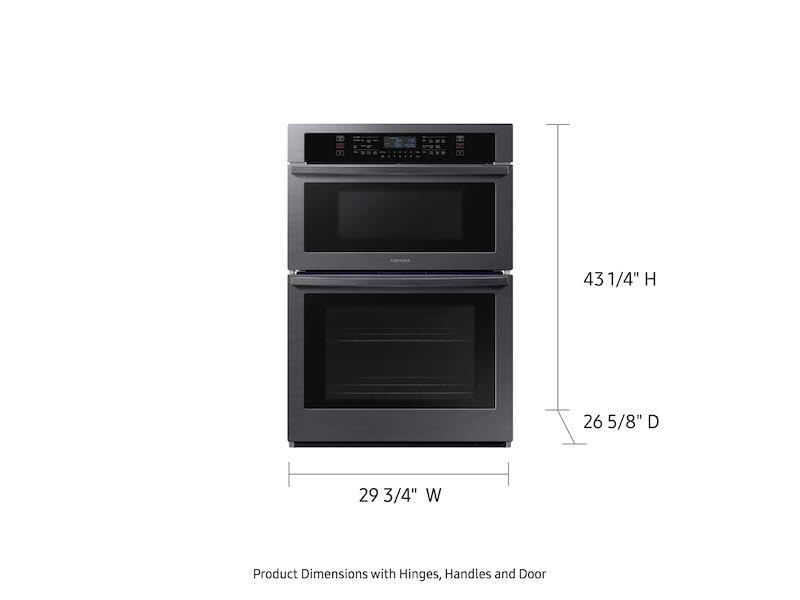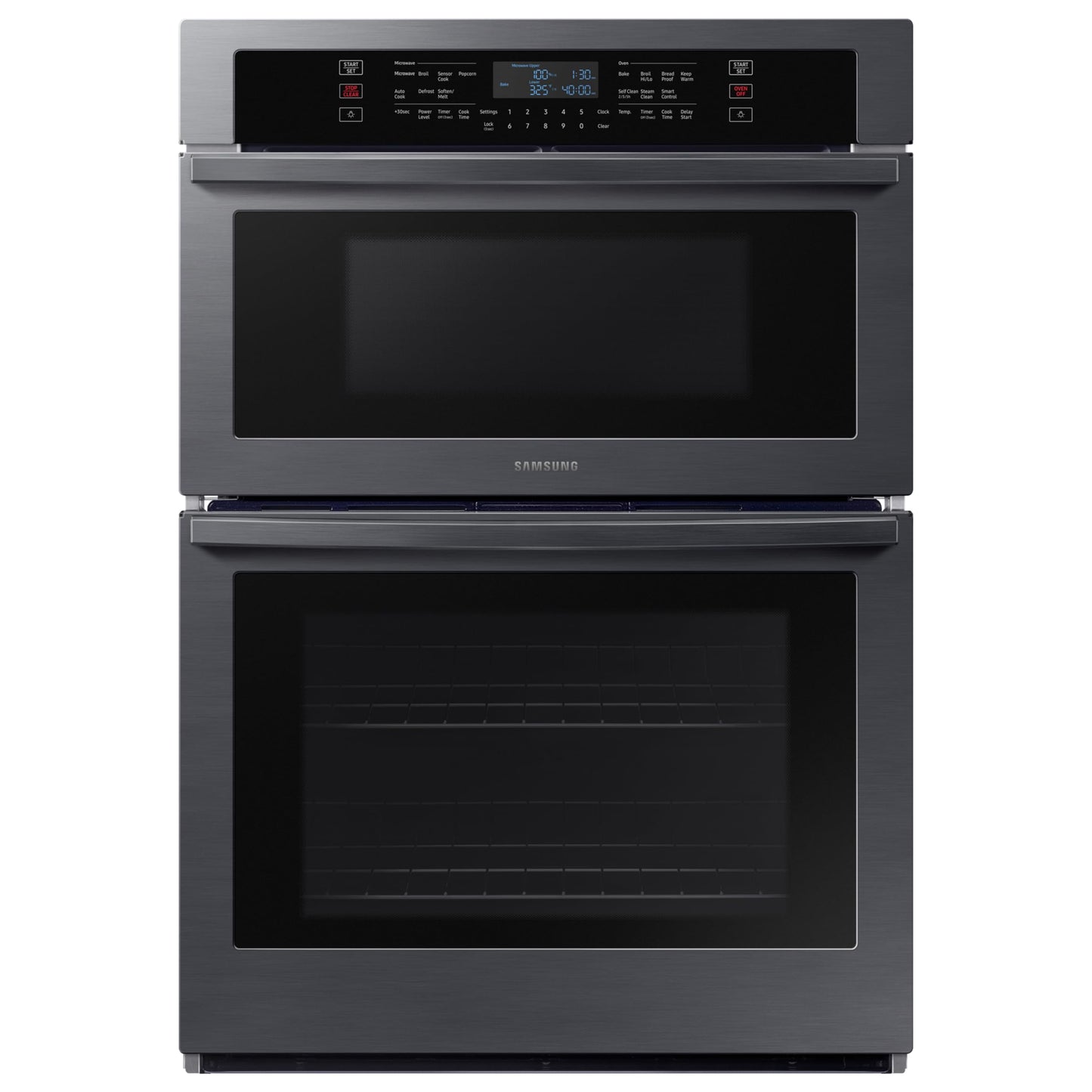 Details: SAMSUNG 30" Electric Wall Oven with Microwave Combination, Black Stainless Steel, NQ70T5511DS/AA. This 30" smart electric wall oven with microwave combo in stainless steel is stunningly bold with a timeless design for the perfect blend of form and function. Bake and roast with even and consistent cooking results, with steam self clean oven for easy clean-up. Large capacity oven accommodates a roast, multiple casserole dishes, or two full racks of cookies.