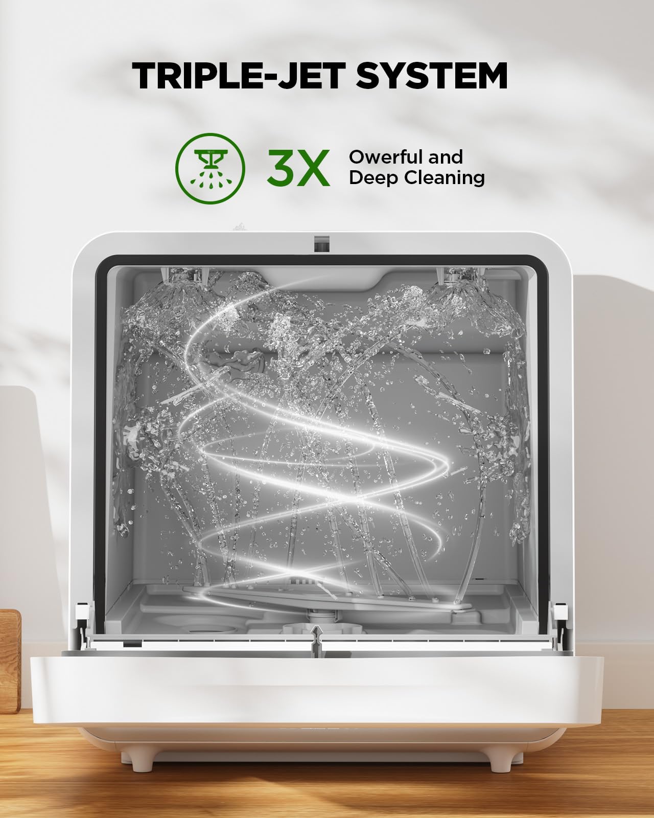 - Sparkling Dishes Every Time - Powered by a patented triple-jet cleaning system, this dishwasher delivers a 360° deep clean. With an extra spray arm compared to standard dishwashers, it tackles stubborn grease, dried food, and hard-to-reach spots with ease. Enjoy more time for yourself and less time scrubbing dishes.