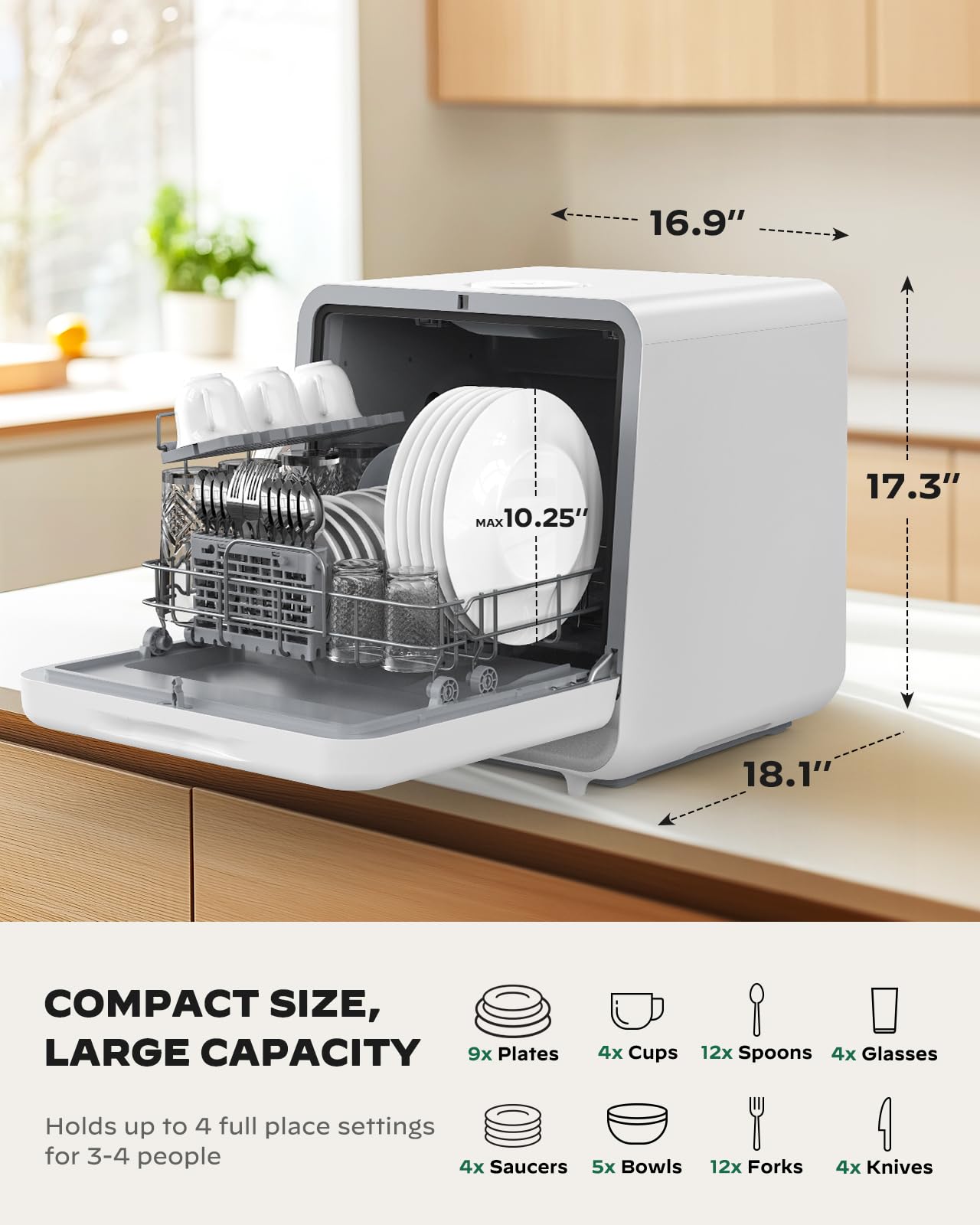 - Compact Size, Large Capacity: The compact dishwasher measures 16.9 x 17.3 x 18.1 inches to fit conveniently in any kitchen. The countertop dishwasher can hold up to 4 full place settings (54 pieces of tableware) and plate sizes up to 10 inches. Ideal for families of 3-4 and perfect for apartments, dorms, and RVs.
