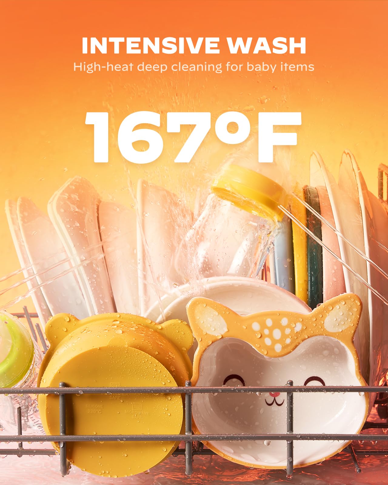 - 6 Wash Programs: Customize your dishwashing routine with our countertop dishwasher, featuring 6 wash programs including Intensive, Babycare, ECO, Rapid, Normal, Glass, and Fruit modes. The Intensive, Babycare mode operates at a high temperature of 167°F to ensure complete and thorough cleaning.