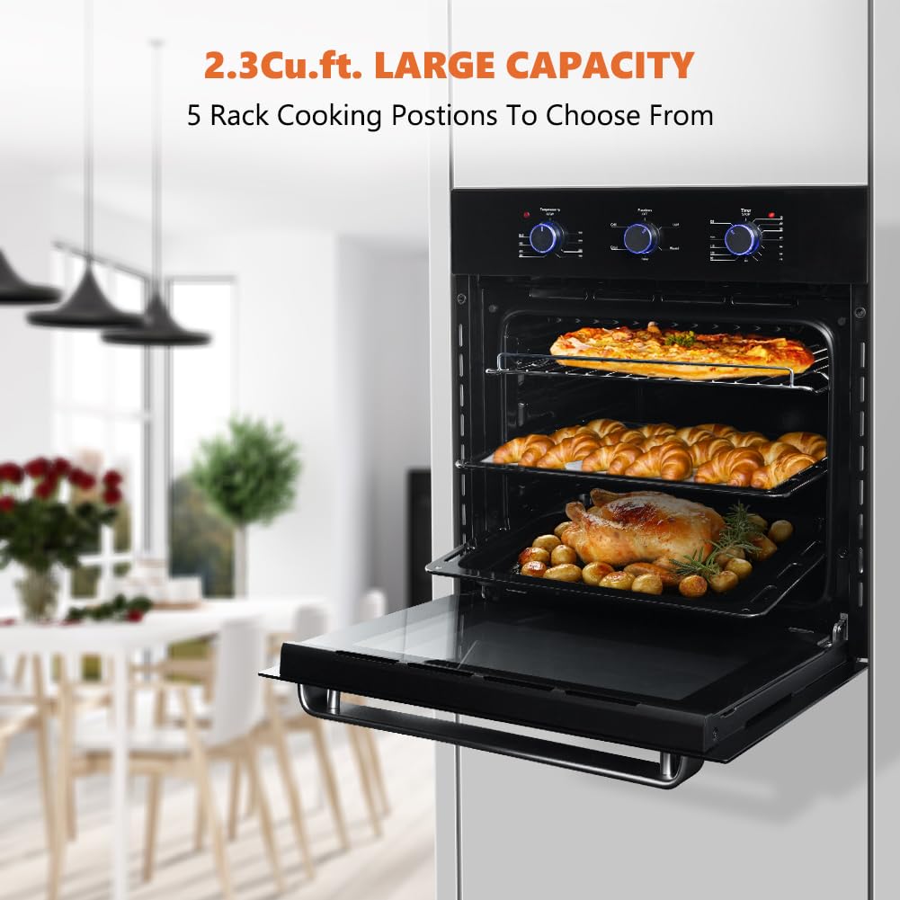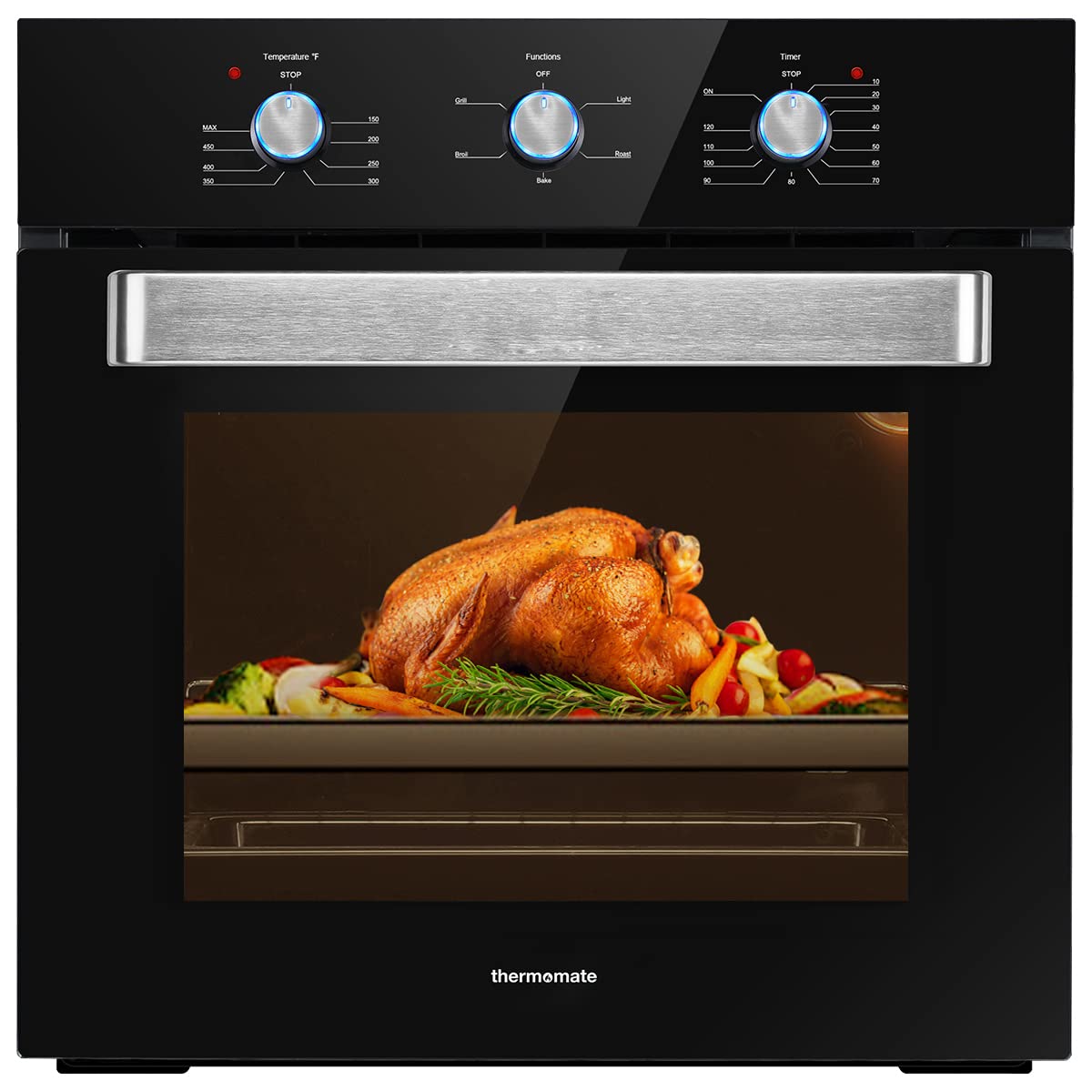Single Wall Oven, thermomate 24 Inch Electric Wall Oven with 5 Cooking Functions, 2000W Built-in Ovens with Mechanical Knobs Control, Black Tempered Glass Finish, ETL Certified