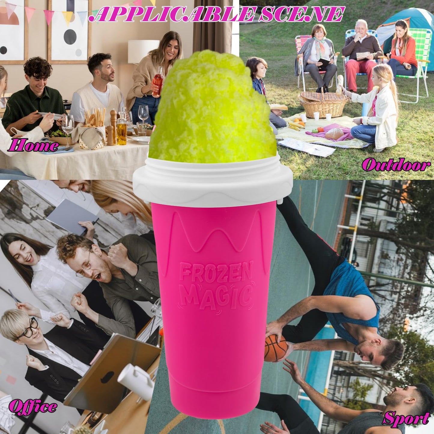 - 【Easy to Use】Household frozen magic squeeze cup are very easy to use.1: Freeze the slushy maker cup 4-5 hours in advance.2: Put the drinks,juice or soda in the fresh-keeping layer of the refrigerator.3: Pour into the fruit juices, milk,yogurt,sodas (or any fruit of your choice) pour into the slushie cup and cover lid;4: then just squeeze the cup with your fingers for 1-2 minutes until you see a smoothie shape.Enjoy the slushy party with different flavors, with juice or soda, or you can add milk to make a thick shake or an ice-cream.