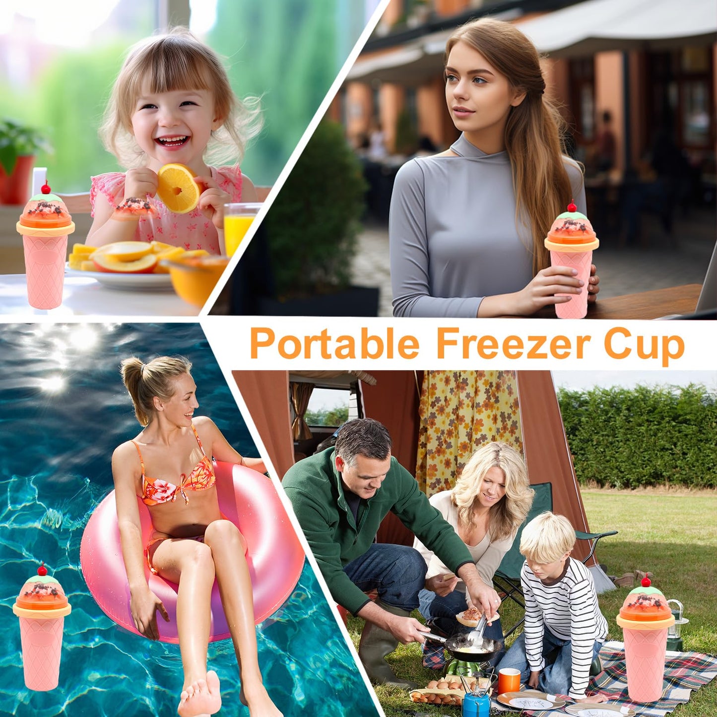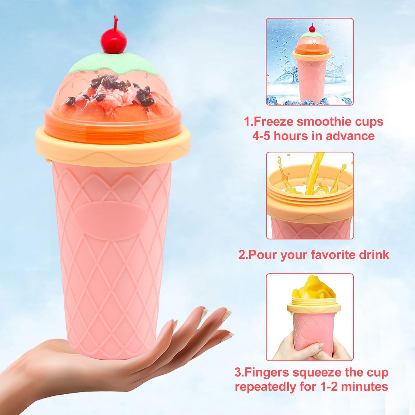 - [Easy to make delicious summer drinks]--The Frozen Magic Cup is very easy to use. You only need to put the cup in the refrigerator for 4-5 hours in advance; after taking it out, pour any drink you like into the cup, which can be milk, cola, juice, soda, etc., and close the lid; finally, use your fingers to Squeeze the Magic Slushy Maker cup for 2-3 minutes until it resembles smoothie and enjoy. Bring you and your family the coolest summer food in the shortest time.