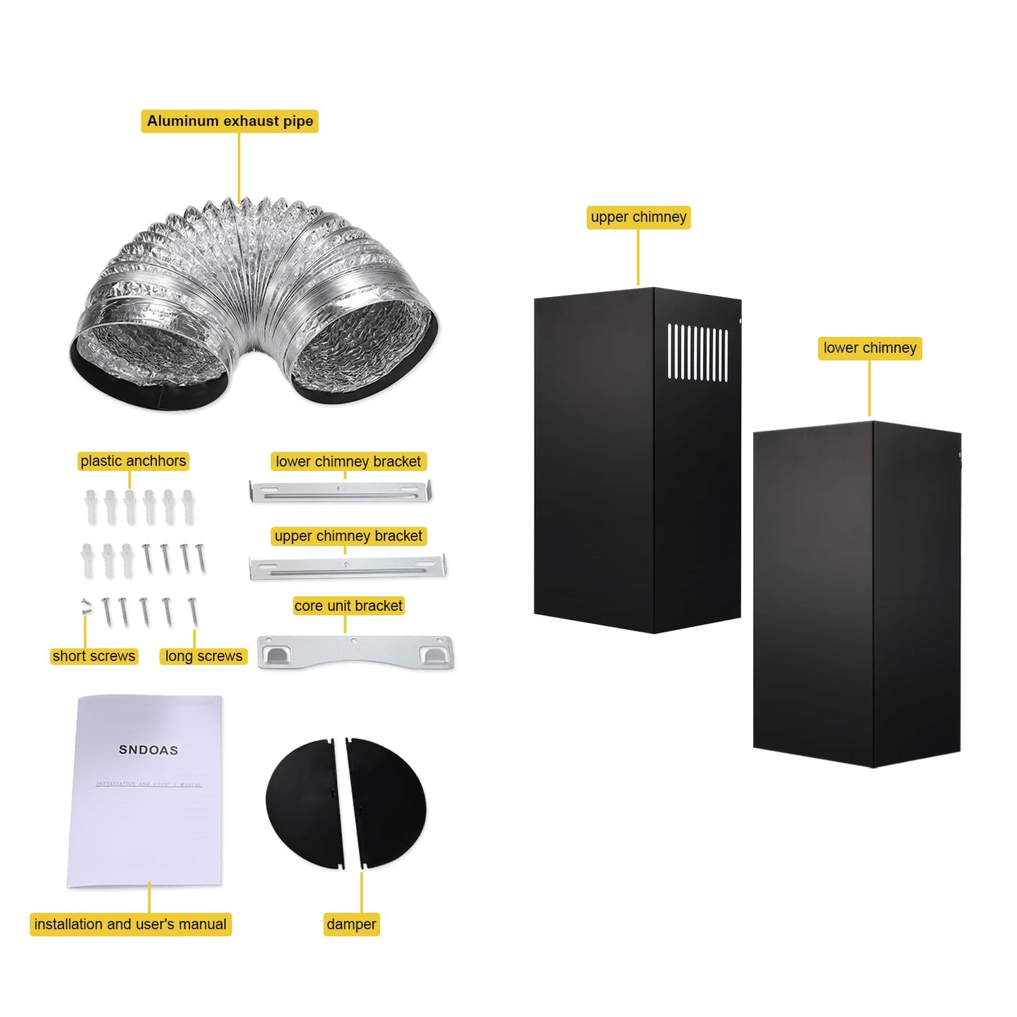 - 【3-year Limited Parts】:Black painted stainless steel stove vent hood, comes with hardware, instructions, duct pipe, air backdraft damper and chimney flue duct covers. 120V/60Hz, 3-prong plug. Please install the range hood according to the product manual and please feel free to contact us if you need any assistance.
