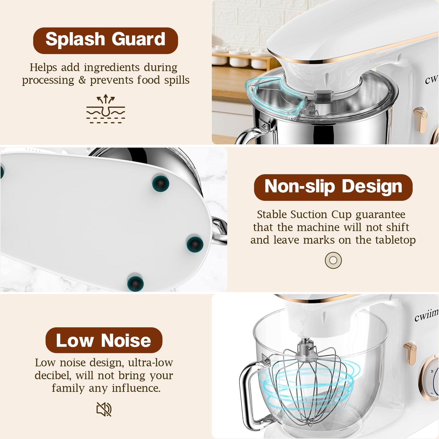- 🧁COMPACT AND STABLE: Dough mixer the stable cake mixer with bowl and stand CWIIM only standing 14.37” tall, and fits underneath most kitchen cabinets. It weighs about 13.23lbs and has 6 silicone suction cups on the bottom to protect the kitchen mixer and desktop, no worries about shifting and falling, works safely and efficiently.