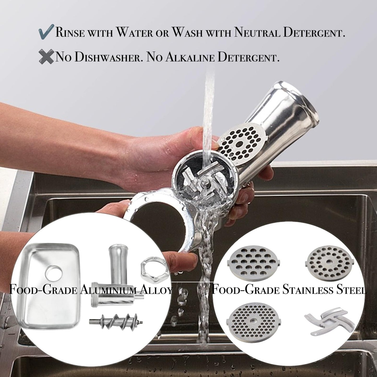 - Fully Functional to Prepare Food : Meat grinder comes with 3 various stainless steel cutting plates for coarse, medium, fine grinding of meat that makes stuffing and filling, 1 big sausage stuff to help to meet your sausage stuffing needs. All cutting plates and cutting blade can be washed in the dishwasher. Complete Accessories includes 1 stainless steel cutting blade, 3 various stainless steel cutting plates; 1 plastic food pusher; 1 Sausage attachment