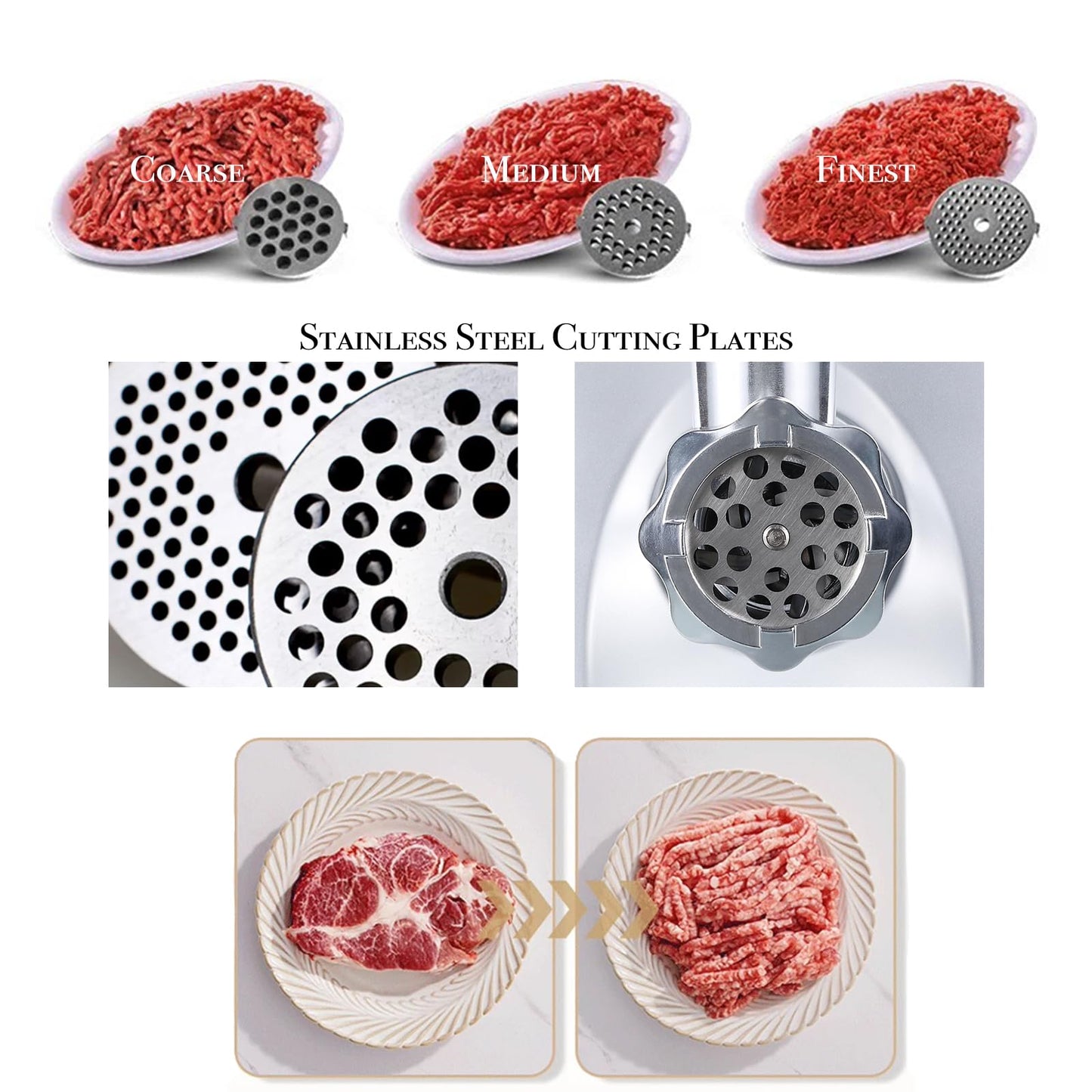 - Fully Functional to Prepare Food : Meat grinder comes with 3 various stainless steel cutting plates for coarse, medium, fine grinding of meat that makes stuffing and filling. All cutting plates and cutting blade can be washed in the dishwasher. Complete accessories includes 1 stainless steel cutting blade, 3 various stainless steel cutting plates; 1 plastic food pusher; 1 sausage staff maker