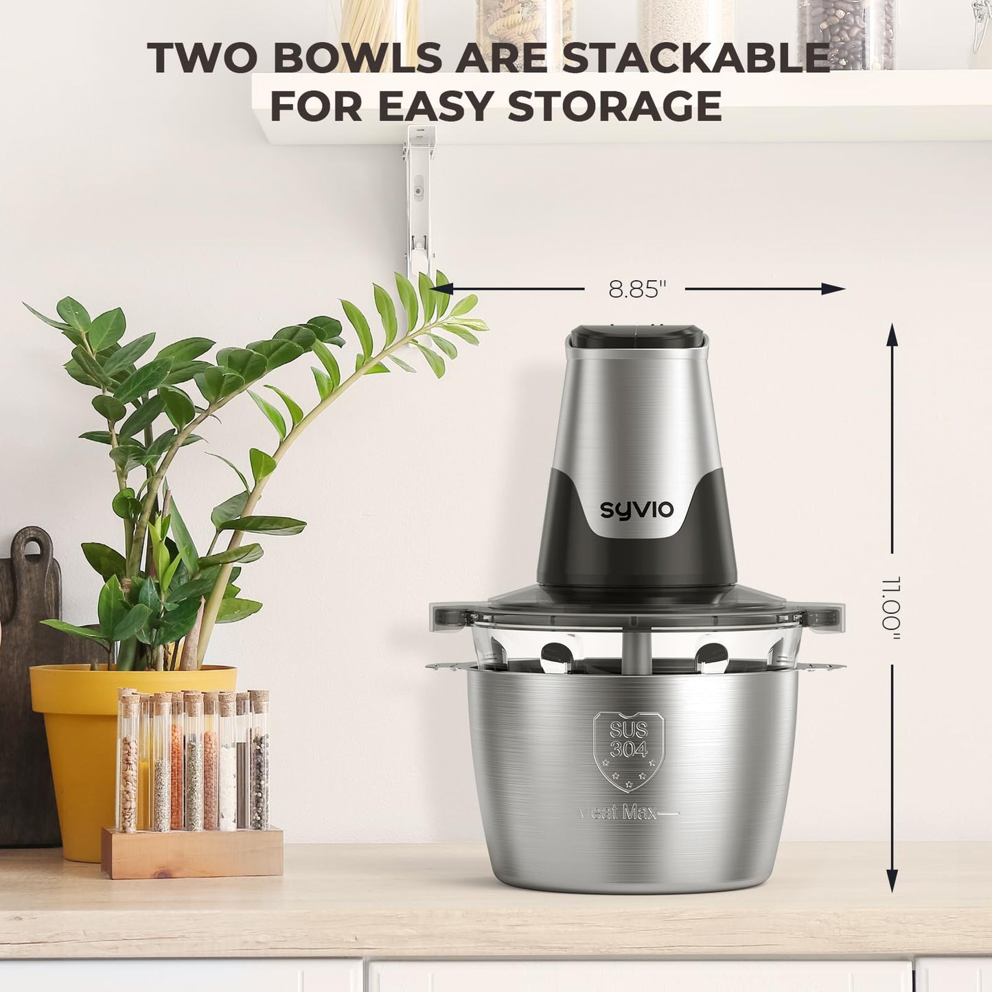Syvio Food Processors with 2 Bowls, Meat Grinder 4 Bi-Level Blades, Mini Electric Food Chopper 450W, for Baby Food, Meat, Onion, Vegetables, 2 Speed, 8 Cup and 8 Cup