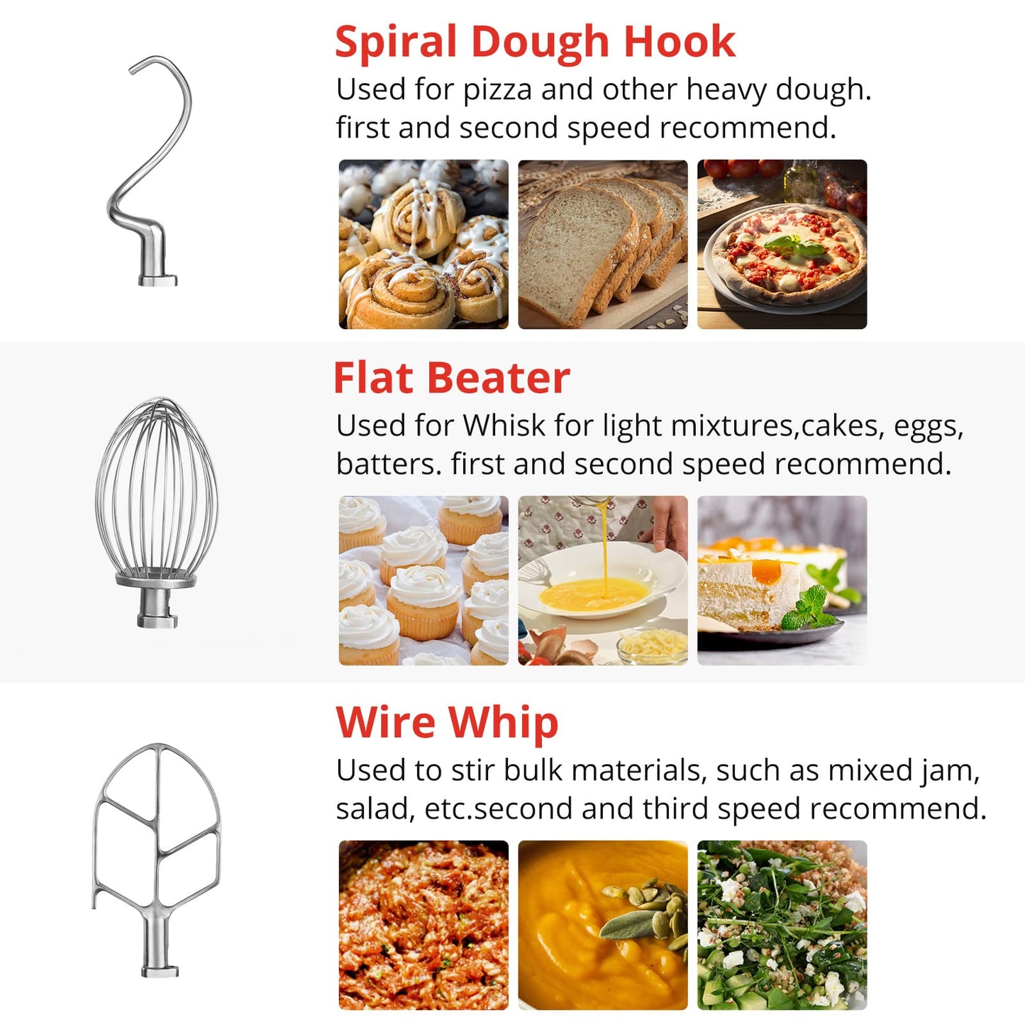 - 【Three Replaceable Attachments】Three replaceable attachments are available. Spiral Dough Hook: Used for smoother mixer operation. Ideal for pizza and other heavy dough. It is commonly used in first and second speed; Flat Beater: Used for mashing potatoes or vegetables, mixing cakes, batters, or icing. It is commonly used in first and second speed; Wire Whip: Used for aerating light mixes such as whipped cream, egg white, and mixing light icings. It is commonly used in second and third speed.