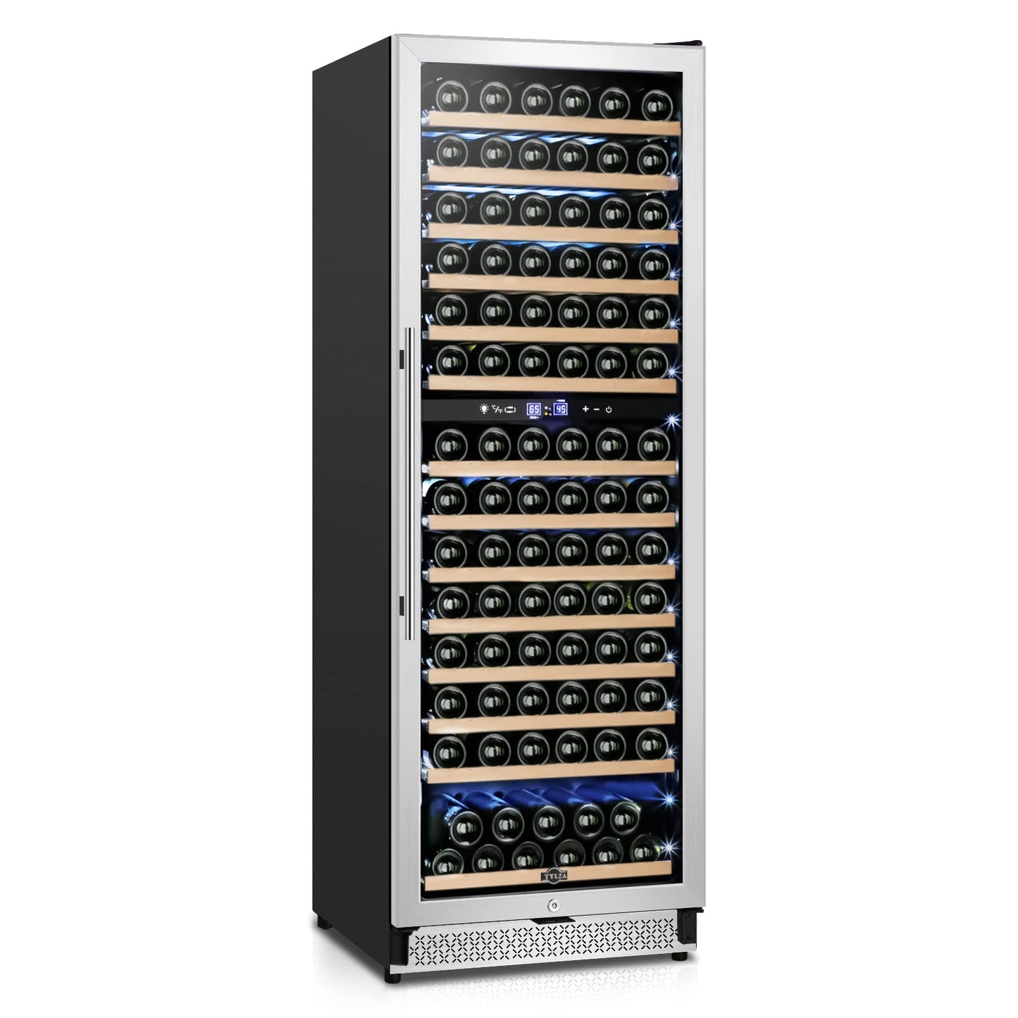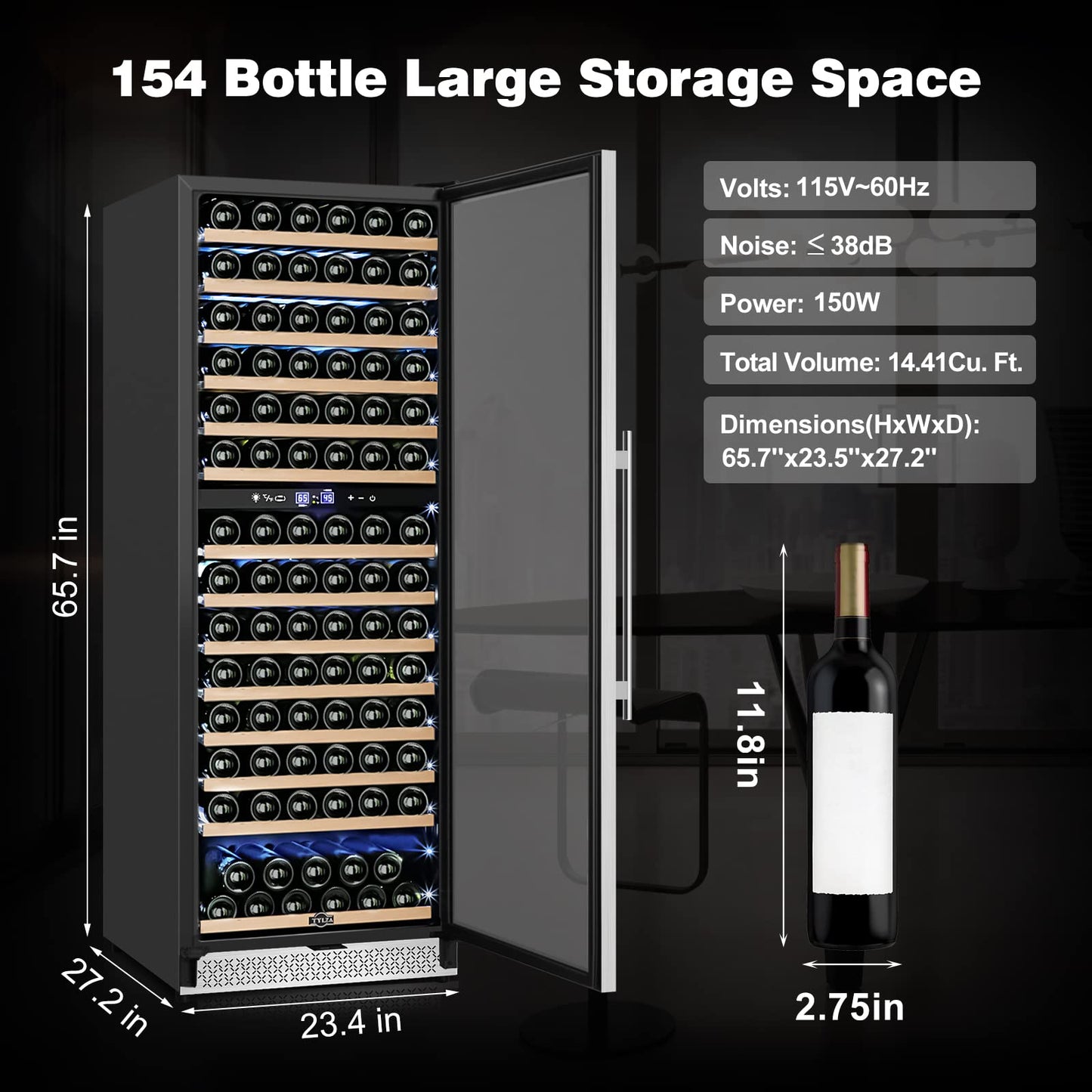- 154 Bottles Large Capacity:The 24'' dual zone wine fridge features 14 beech wooden shelves that can store up to 154 bottles of standard Bordeaux (750 ml) wine and the bottom shelf has large capacity that you can load large bottles;Durable beech wooden shelves No shake No damage bottle when sliding in or out;