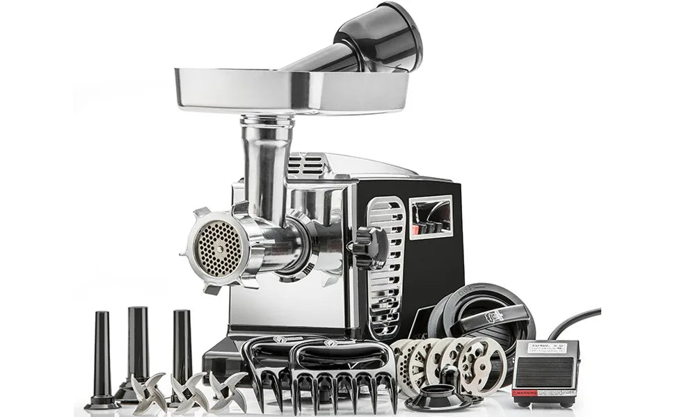 w/Foot Pedal Heavy Duty Electric Meat Grinder & Sausage Stuffer: 6 Grinding Plates, 3 S/S Blades, 3 Sausage Tubes, Kubbe - Black