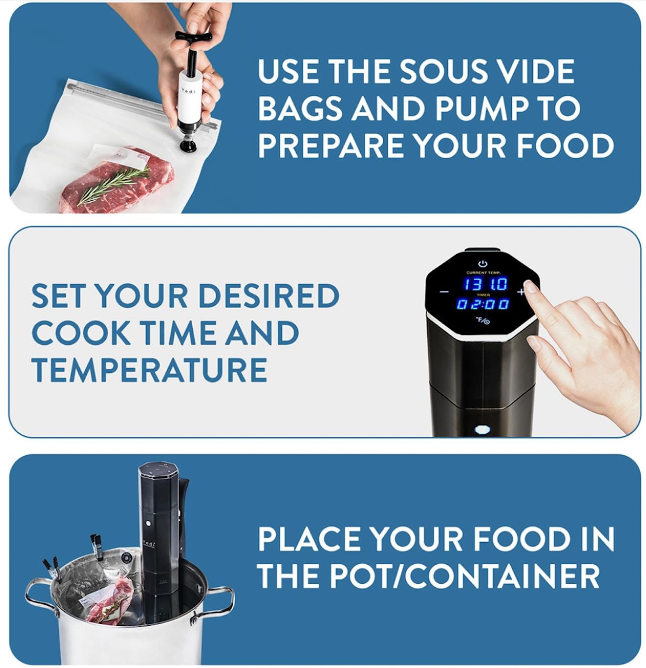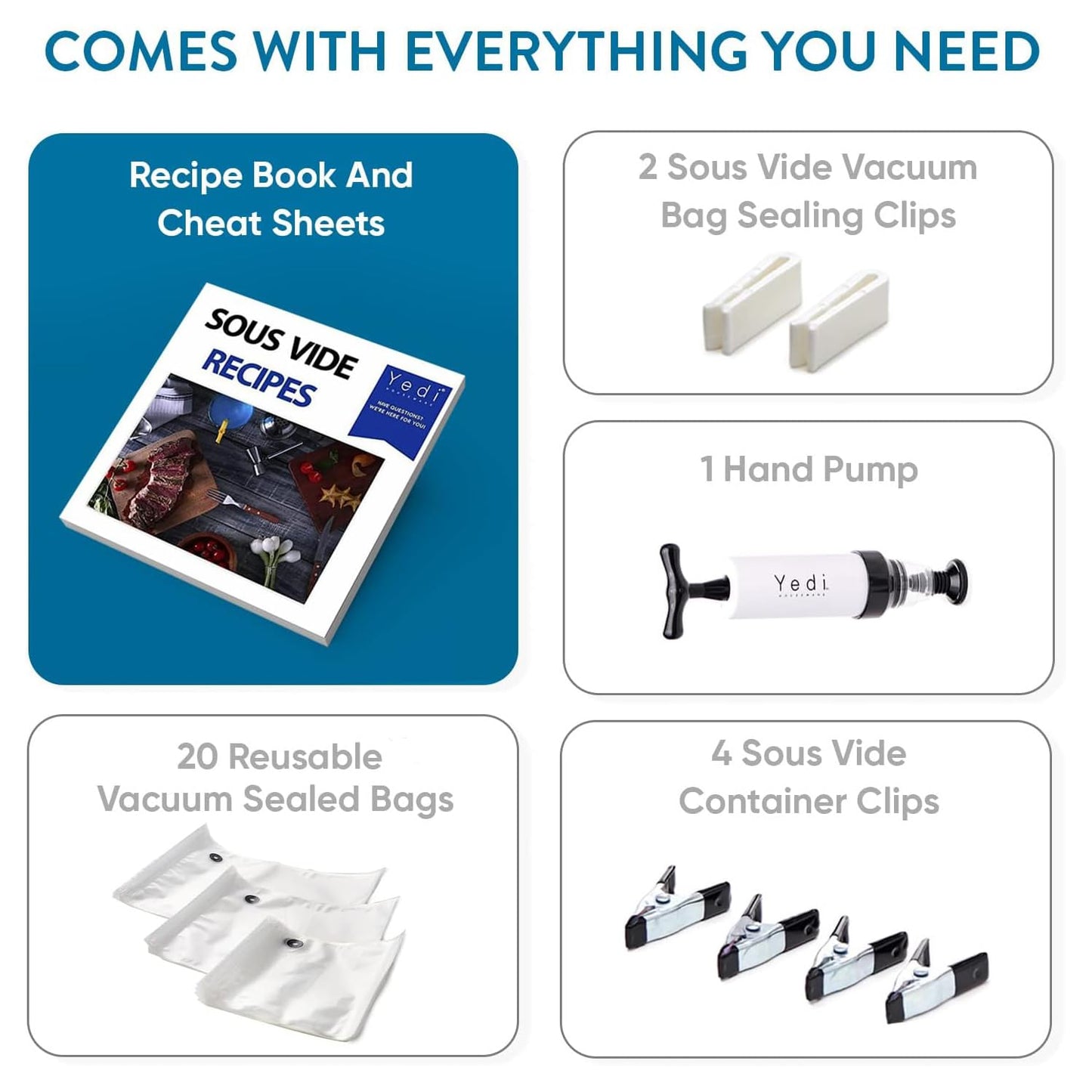 - SOUS VIDE DELUXE ACCESSORY KIT: Included is 1 hand pump, 20 Reusable BPA Free Vacuum Sealed Bags, 4 sous vide container clips, 2 sous vide vacuum bag sealing clips, Recipe Book and Cheat Sheets.