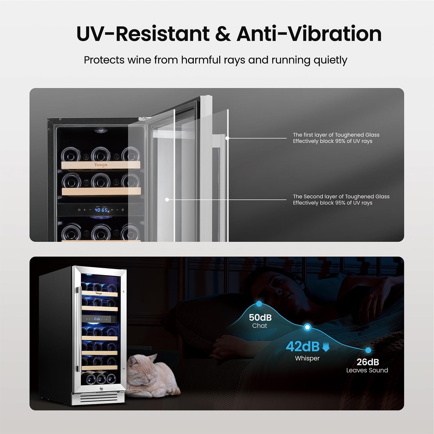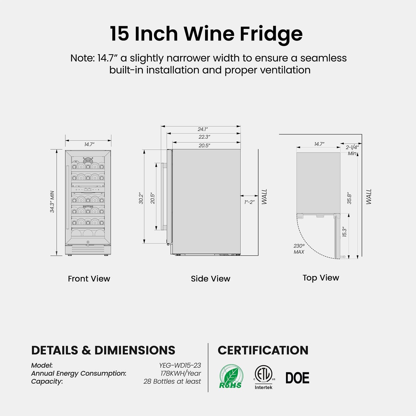 Yeego Wine Fridge Dual Zone 15 Inch, 28 Bottles Wine Cool Refrigerator with Glass Door & Safety Lock, Built-in/Freestanding/Under Counter, Perfect for Home & Kitchen