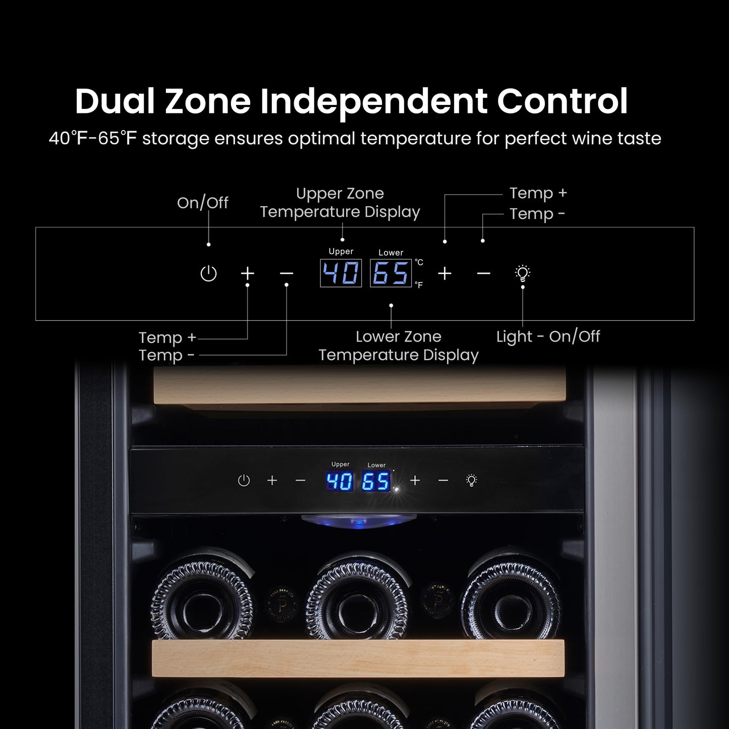 - 【WINE FRIDGE DUAL ZONE】 Our dual-zone wine cooler features 2 independent temperature control, with adjustable settings from 40℉~65℉, you can keep your red, and white wines or champaigns at their optimal temperatures, enhancing both the flavor and longevity of your collection.