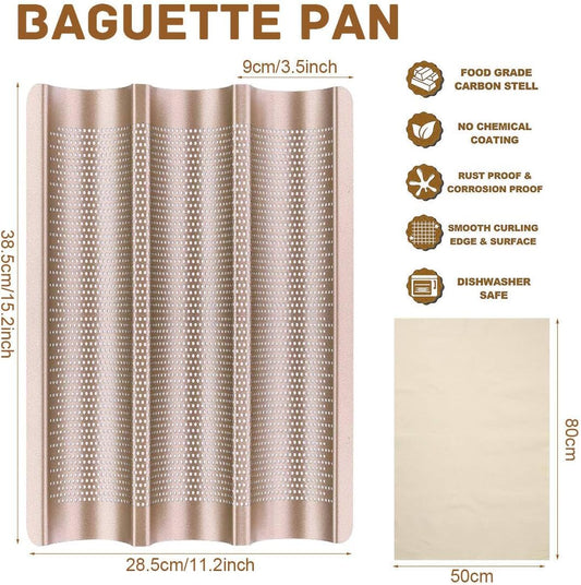Baguette Bread Pan, Perforated French Bread Baking Pan, Nonstick 3 Loaf Bread Pans for Baking, with Baguette Kit – Includes Proofing Cloth & Dough Cutter, 15x11 Inch Gold
