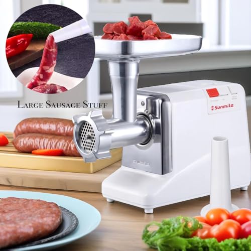 Sunmile Electric Meat Grinder and Sausage Maker - 1HP 1000W Max - Stainless Steel Cutting Blade and 3 Grinding Plates,1 Big Sausage Staff Maker, White