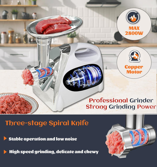 VNIMTI Electric Meat Grinder, Heavy Duty Meat Grinders 2800W, Stainless Sausage Maker Meat Mincer Machine with Blade, 3 Plates, Sausage Stuffer Tube and Kubbe Kit for Home Kitchen Use (2800W-White)
