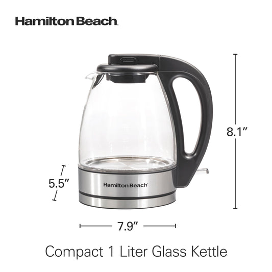 Hamilton Beach Glass Electric Tea Kettle, Water Boiler & Heater, 1 Liter, 1500 Watts for Fast, BPA Free, Cordless Serving, Auto-Shutoff & Boil-Dry Protection, Soft Blue LED (40930)
