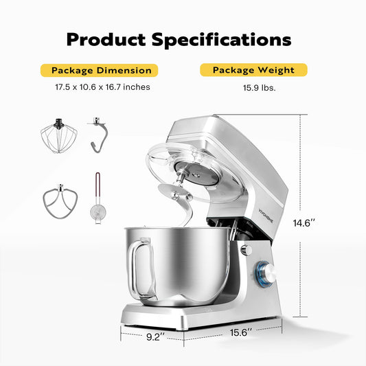 HOWORK 8.5QT Stand Mixer, 660W 6+P Speed Tilt-Head, Electric Kitchen Mixer With Dishwasher-Safe Dough Hook, Beater, Wire Whip & Pouring Shield(8.5 QT, Silver)