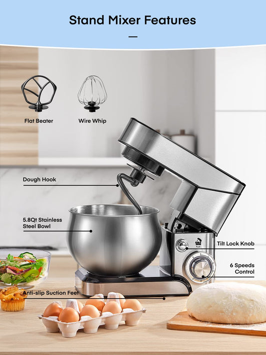 Stand Mixer FOHERE, 5.8 QT Stainless Steel Mixer with Dough Hook, Mixing Beater, Wire Whip, Dishwasher-safe, 6+P Speeds Tilt-Head Kitchen Dough Mixers for Cake, Electric Home Cooking Kitchen Mixer