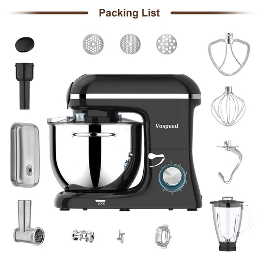 Vospeed 9 IN 1 Stand Mixer, 850W Tilt-Head Multifunctional Electric Mixer with 7.5 QT Stainless Steel Bowl, 1.5L Glass Jar, Meat Grinder, Hook, Whisk, Beater Dishwasher Safe (Black)