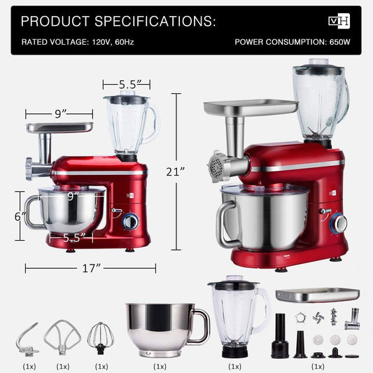 VIVOHOME 3 in 1 Multifunctional Stand Mixer with 6 Quart Stainless Steel Bowl, 650W 6 Speed Tilt-Head Meat Grinder, Juice Blender, Red