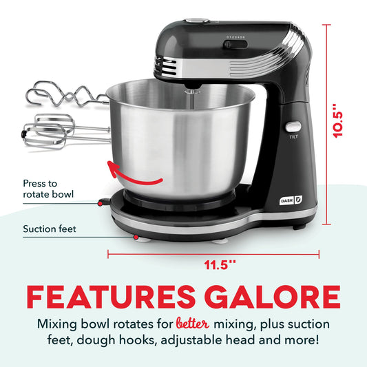 Dash Stand Mixer (Electric Mixer for Everyday Use): 6 Speed Stand Mixer with 3 qt Stainless Steel Mixing Bowl, Dough Hooks & Mixer Beaters for Dressings, Frosting, Meringues & More - Black