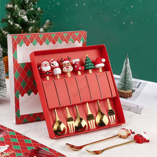 WALFOS 6PCS Різдвяний подарунок Glod Ложка Набір виделок Лось Різдвяна ялинка Декорація Десерт Ложка Фруктова Вилка Кавова ложка Набір столових приладів