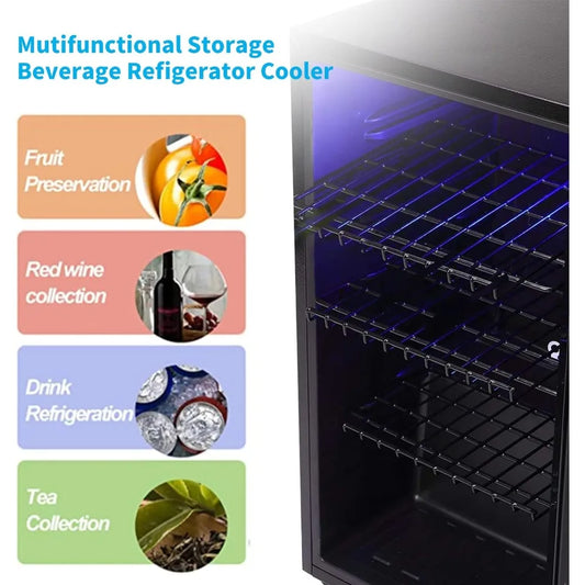 Beverage Refrigerator and Cooler Freestanding, 96 Cans Mini Fridge with glass door and Lock, Small Drink Fridge, with LED Light