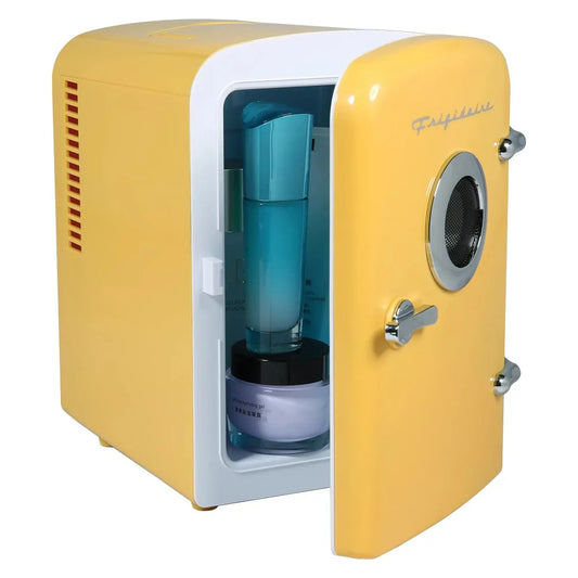Portable Retro 6-can Mini Cooler, Built-in Bluetooth(R) Speaker, Thermoelectric cooling and warming system, Yellow