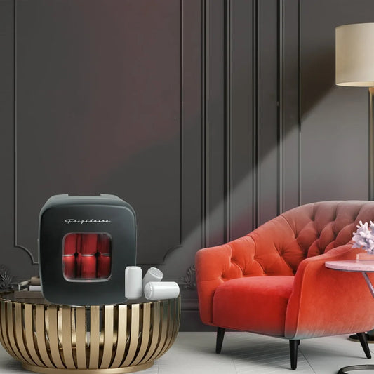 Retro 6 Can Mini Beverage/Skincare Cooler, features a Carrying Handle for easy Transportation and a Design to Fit on Any Surface